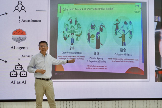 随后,魏然教授就社交媒体对社会和个人的影响展开探讨。他认为社交媒体的“去中心化”帮助了公域的建构,可随着锁定用户算法的运用,社交媒体私域性大大增强。同时,社交媒体的过度使用引发了用户智力与注意力下降、上瘾症、幸福感知力下降等问题。他指出社交媒体正在积极拥抱AI、VR等新技术,而这又将引发新一轮的数据偏见、回音室效应和深度造假问题。他向我们展现了AI、VR技术在各领域的最新应用,如虚拟社交平台“Facebook Horizon”、日本庆应大学的远距生存课题研究、虚拟数字人、AI图片和视频生成等,并提出了“未来我们是否还会拥有客观真实存在的现实?”这一令人深思的问题。