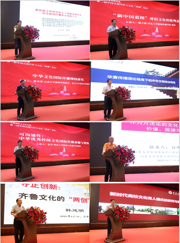 主旨演讲环节,北京印刷学院原副校长王关义教授,河北大学det365登录网站主页韩立新教授,云南大学det365登录网站主页院长、复旦大学新闻学院廖圣清教授、厦门大学det365登录网站主页副院长谢清果教授,暨南大学新闻与传播学院晏青教授,det365登录网站主页学术委员会主任刘明洋教授,中共山东省委党史研究院一级巡视员、临沂大学原副校长、齐鲁理工学院高等教育研究院名誉院长韩延明教授,齐鲁理工学院党委副书记、常务副院长张庚灵教授依次作了题为“新文科建设和人工智能发展要求,培养新闻传播拔尖创新人才”“‘新中国蓝图’对旧文化的批判态度”“中华文化国际传播网络研究”“华夏传播理论视角下的中华文明突出特性”“可沟通性:中华优秀传统文化国际传播命题与逻辑”“作为方法论的文化‘两创’:价值、规律与主体”“守正创新:齐鲁文化的‘两创’探索”“新时代高校文化育人模式的研究与实践”的主题报告。主旨演讲部分由中国新闻史学会秘书长、中国人民大学新闻学院教授邓绍根主持。