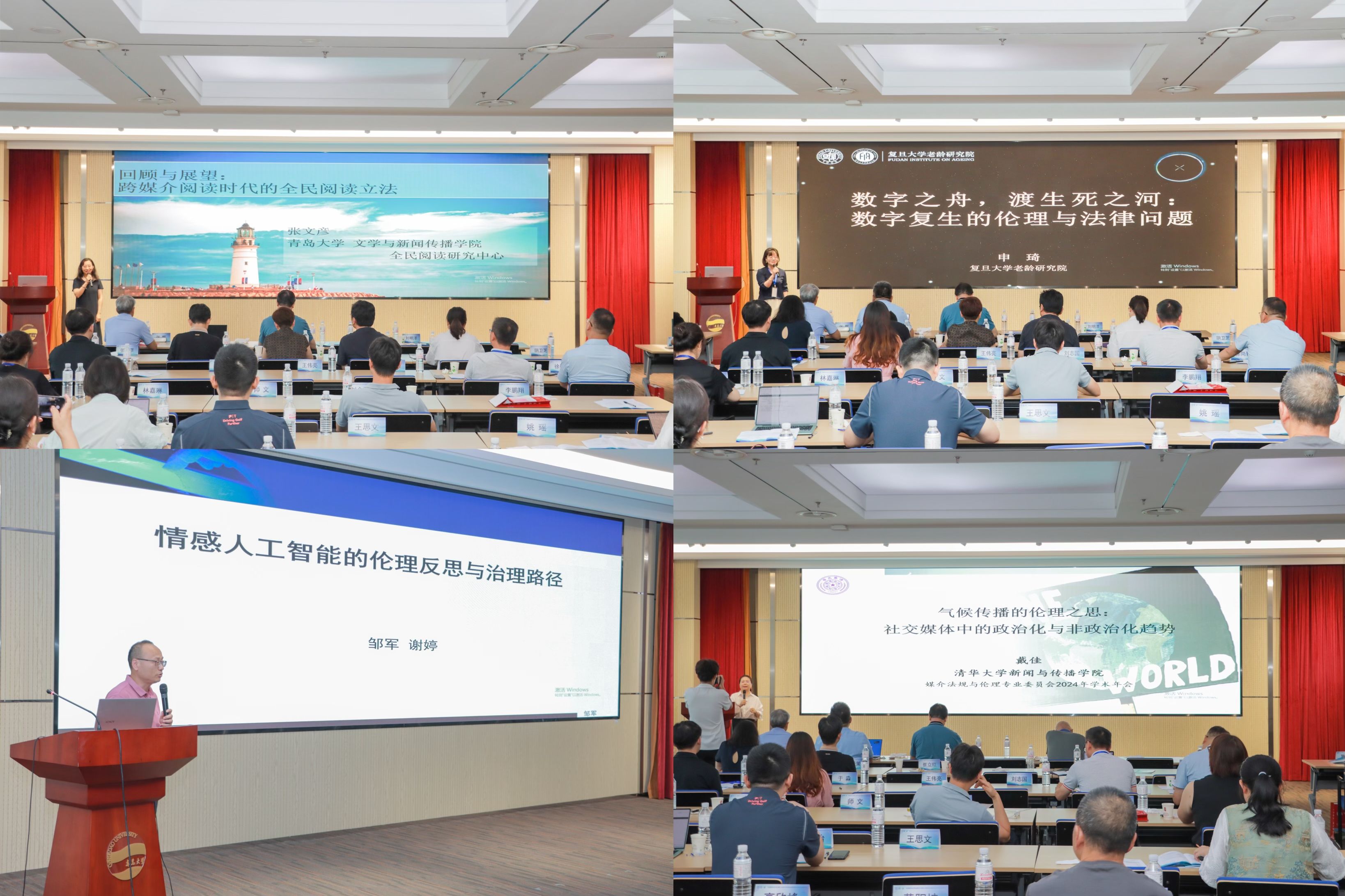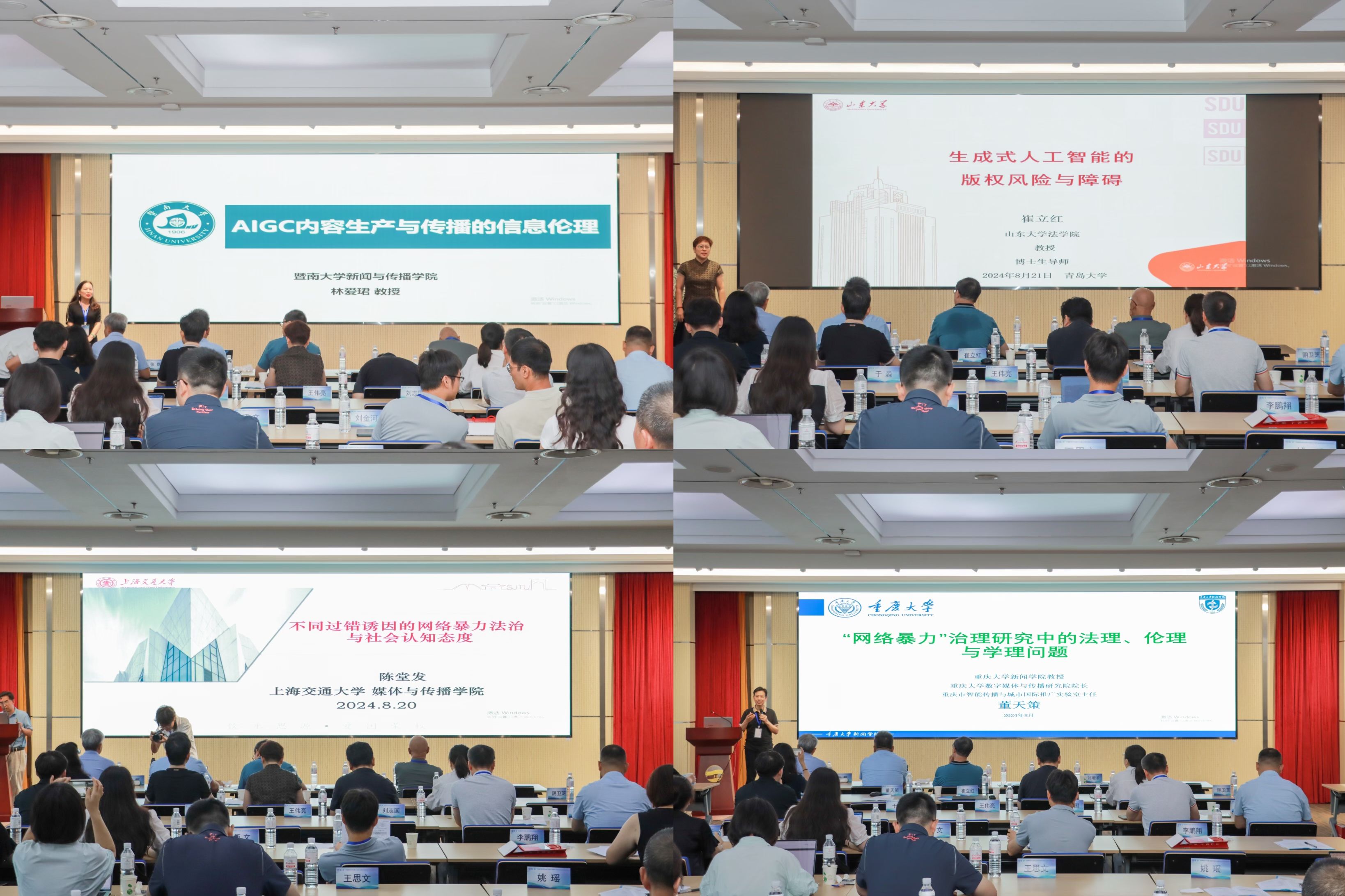 主题演讲环节,由青岛大学文学与det365登录网站主页党委书记张辉主持。张辉向来自全国各地的专家学者表示热烈欢迎并期待专家学者们创新观点和睿智表达。暨南大学新闻与传播学院教授林爱珺以“AIGC内容生产与传播的信息伦理问题”为题发言,提出发展以人为本的人工智能,引导技术向善,防范一切政治风险、信息灾害和人的异化。det365登录网站主页法学院副院长崔立红聚焦“生成式人工智能的版权风险与障碍”的主题,指出AI合理使用要慎行,构建我国生成式人工智能与版权法律的发展与协调。上海交通大学媒体与传播学院教授陈堂发和重庆大学数字媒体与传播研究院院长董天策分别运用量化研究和案例分析方法阐释了网络暴力法制与伦理的相关研究成果,发表“网络暴力法制的认知态度调查”和“网络暴力治理研究中的法理、伦理和学理问题”演讲,呼吁学界与社会各界高度重视网络暴力治理。青岛大学文学与det365登录网站主页副院长张文彦进行题为“回顾与展望:跨媒介阅读时代的全民阅读立法”的发言,从立法角度梳理了全民阅读法制建设。复旦大学老龄研究院教授申琦讨论了生命过程的生死伦理问题,在题为“数字之舟,渡生死之河:数字复生的伦理与法律问题”的发言中,进行了推动老龄社会治理“中国方案”的重新思考。广州大学新闻与传播学院党委书记邹军在题为“情感人工智能的伦理反思与治理路径”的发言中提出重拾人的主体性方案。清华大学新闻与传播学院长聘副教授戴佳聚焦“气候传播的伦理反思:社交媒体中的政治化与非政治化趋势”主题,与学者们共同探讨气候变化政治化与非政治化的利弊。