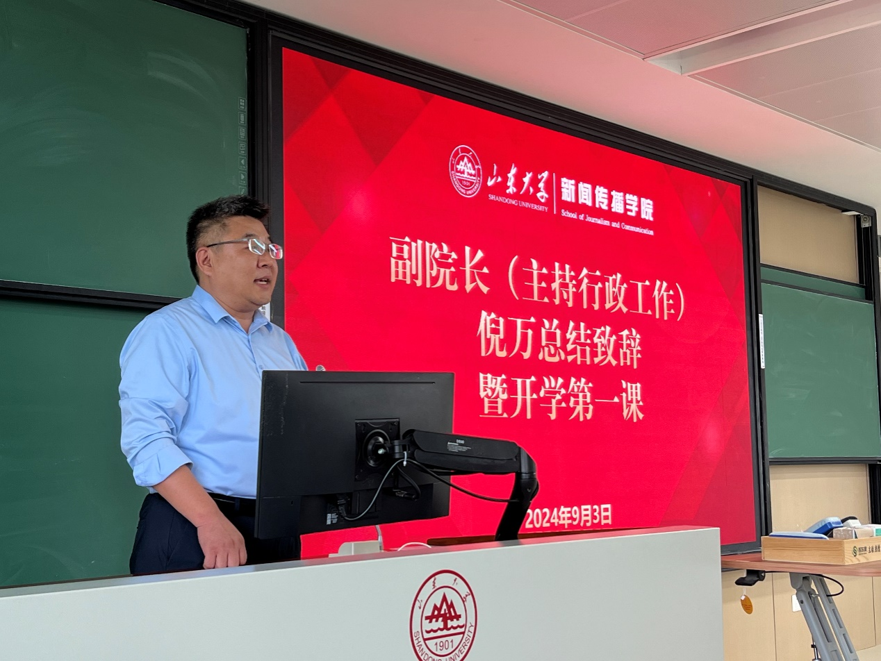 倪万进行总结致辞,并为新生们讲授了“开学第一课”。首先,倪万从det365登录网站主页的院史谈起,回顾了学院自1946年创办新闻专修班以来的发展历程。从红色革命的起点,到新时代的辉煌成就,学院始终坚守初心,不断前行;其次,他强调,新生应当始终“瞄准学科前沿,对接国家主流战略”,在意识形态安全、文化建设等方面作出积极贡献,特别是媒体融合与全媒体建设、舆论生态治理、国际新闻与传播等三大重点领域;最后,倪万鼓励新生们在研究生阶段深入思考“新传何为”,从研究层面为学科发展做出自己的贡献。