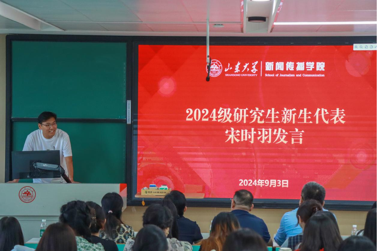 随后,研究生代表宋时羽发言。他围绕“新”这个主题,从学习环境、学术氛围和成长阶段三个方面进行了阐述,并表达出对未来的憧憬与向往。他提出,作为新时代的研究生,要将“小我”融入到“大我”的时代浪潮之中,将学术论文写在中国的大地上,把中国声音传播到世界舞台上。