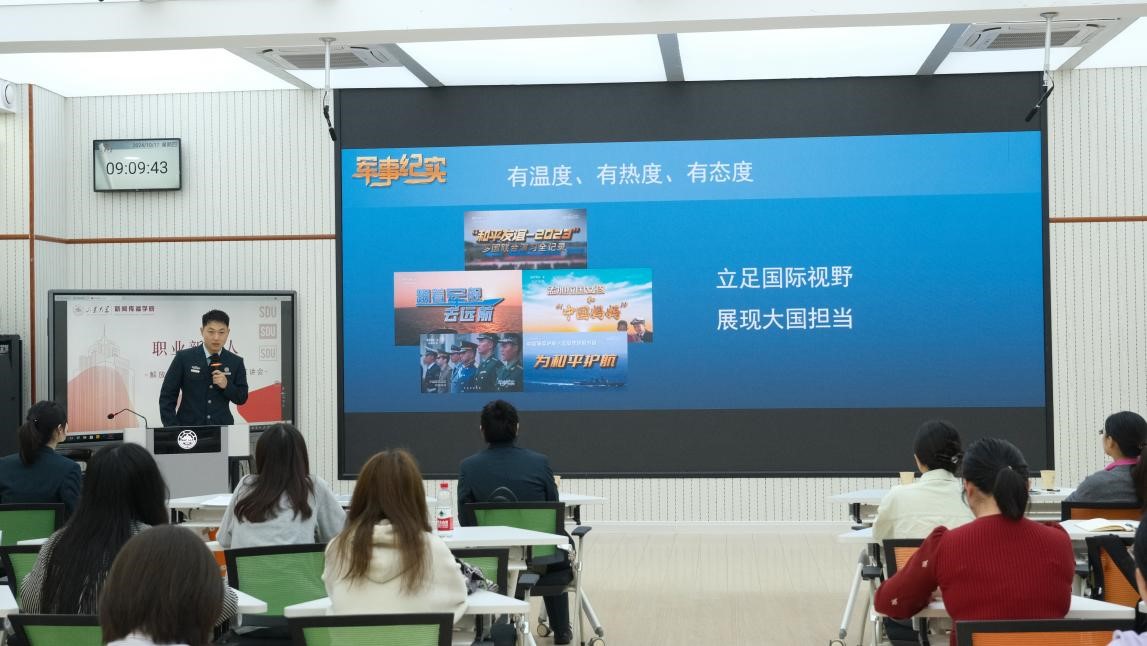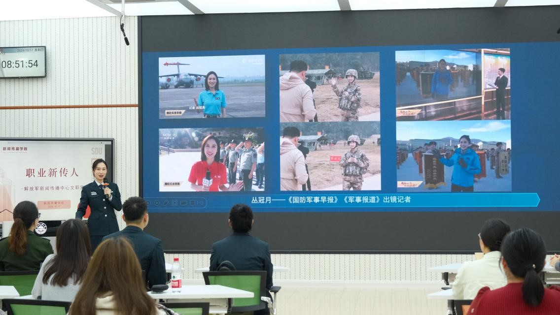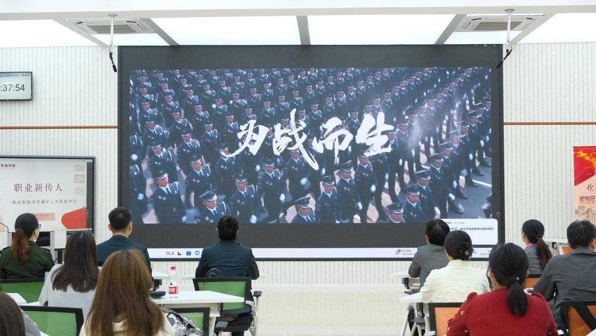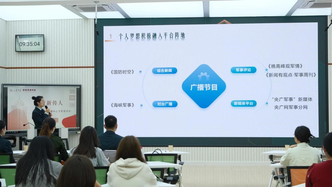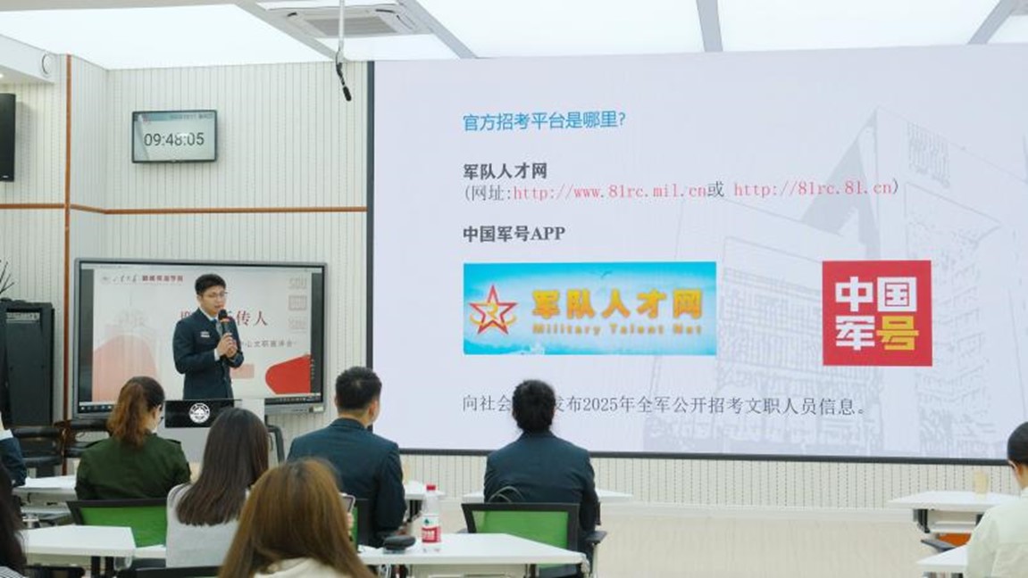 随后,国防军事频道《国防军事早报》栏目、国防军事频道《军事纪实》栏目、国防军事频道《防务新观察》栏目、中央人民广播电台《国防时空》栏目相关工作人员分别就解放军新闻传播中心广播电视部各栏目情况、平台资源优势、优秀报道内容、优秀文职人员工作情况等方面进行了更为详尽的宣讲与介绍。解放军新闻传播中心作为集广播、电视、新媒体于一体的全媒体综合平台,能借助平台优势最大限度整合资源,为有理想有追求的年轻人提供机会与舞台,吸引其投身于改革强军的伟大征程之中。文职人员既能走进军营穿上帅气靓丽的制服,又能进入央视和央广等国家级媒体当记者、做主播;既能坐着军舰环球航行、去海报最高的边防点位看祖国大好河山,又能加入战地记者队,深入战场一线,用我们的镜头记录人民子弟民保家卫国的奉献与担当。
