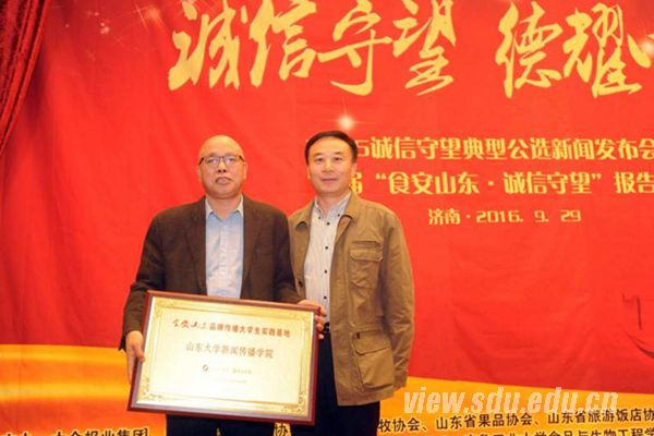 近日,由大众报业集团联合省食品工业协会等主办,齐鲁晚报、det365登录网站主页承办的2016诚信守望典型公选新闻发布会暨大学生实践基地揭牌仪式在det365登录网站主页中心校区举行。det365登录网站主页党委书记王德胜致欢迎辞,副院长刘明洋代表学院为实践基地揭牌。