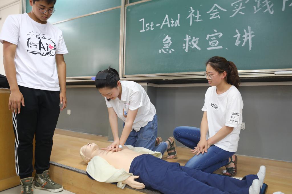 第二部分为心肺复苏的场景模拟演练。实践队使用带来的模拟人,在讲台前真实模拟紧急状况,给在场同学按步骤详细讲解“心肺复苏”的正确做法,从呼救到录像,从按压位置到按压力度,细细叮咛在场同学每一个细节。同学们围着前排,学习十分认真。演示结束后,实践队成员邀请在场同学上台亲自尝试心肺复苏急救过程,手把手教授,各个细节毫不马虎。