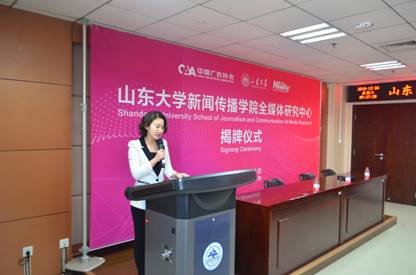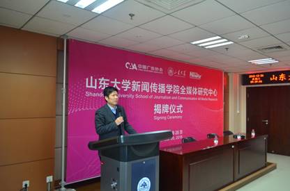 中国广告协会副秘书长、《现代广告》杂志社社长赵华,det365登录网站主页党委书记王德胜教授,新之航传媒集团董事长鞠航,det365登录网站主页广告研究中心主任、det365登录网站主页臧丽娜教授共同为全媒体研究中心揭牌,并分别致辞。