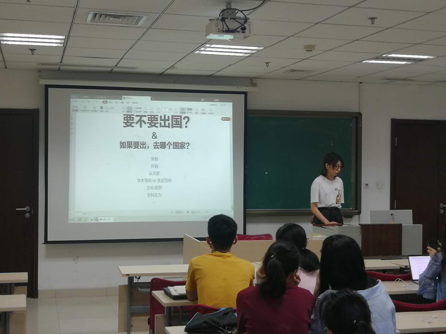 活动伊始,获得伦敦政治经济学院与南加州大学双学位的邱小奕通过一份留学准备清单,为同学串联起申请留学的一系列准备工作。首先她建议大家要明确对自己的定位:包括自己的出国留学需求,对美国、英国、中国香港等不同国家或地区之间的偏好以及学校的排名、专业领域,同时强调“学校要求”“绩点”和“语言成绩”的重要性。随后,她就出国申请文书(推荐信、个人简历、个人陈述)方面给出了许多较为实用的建议,比较了DIY与选择中介的利弊,给同学们提供了一些参考。