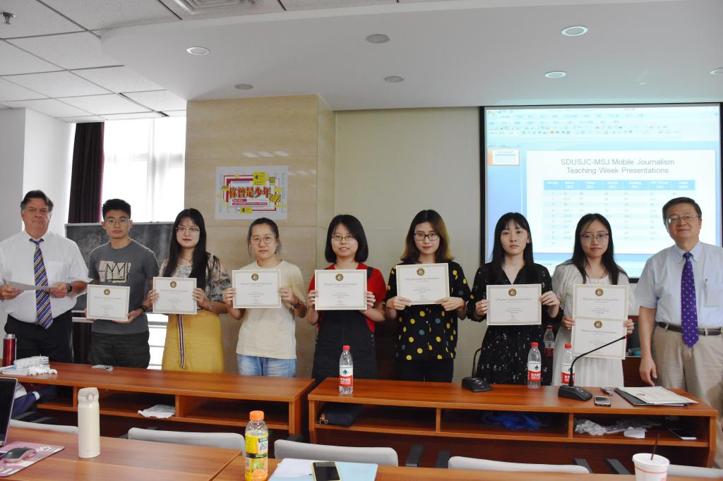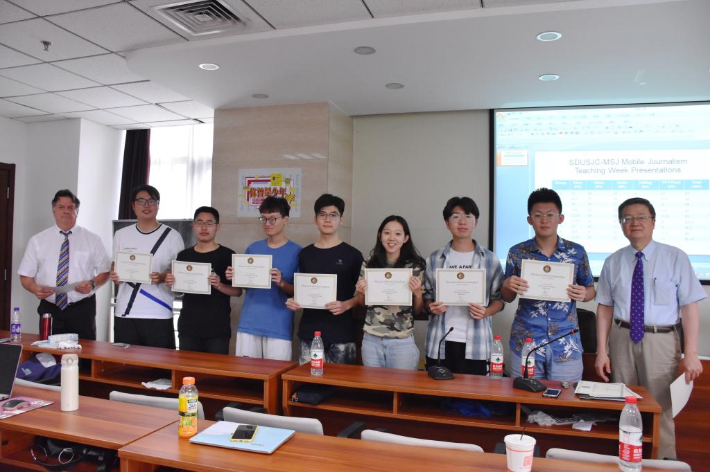 一周紧张而充实的课程不仅让学生们从理论上对媒介融合背景下的移动工具新闻报道有了具体的认知,而且亲身体验了移动工具创作新闻作品的过程,开拓了视野,增强了专业知识,提升了实践技能。中心校区新闻专业的侯雨杭同学感受颇深,他说通过这次学习使他认识到大学学习不是象牙塔内的闭门造车,还要非常注重专业的实践,密苏里新闻学院的教学理念和优质的课程让他受益匪浅;而且通过这次对“移动新闻”(Mobile Journalism)的亲自体会和实践,他感觉自己在向一个专业的媒体工作者逐步迈进。来自威海校区文化传播学院新闻学专业的刘琳同学表示,她很珍惜一校三地一体发展提供的学习机会,她和班级里的大部分同学都来中心校区参加了这次暑期海外师资课程,通过该课程的学习,了解了传媒行业国际前沿发展趋势、掌握了基本的移动设备视频制作的流程和技能,同时学习了如何从一个独特的视角将新闻展现给大众,培养了自己的思考能力和团队合作精神。