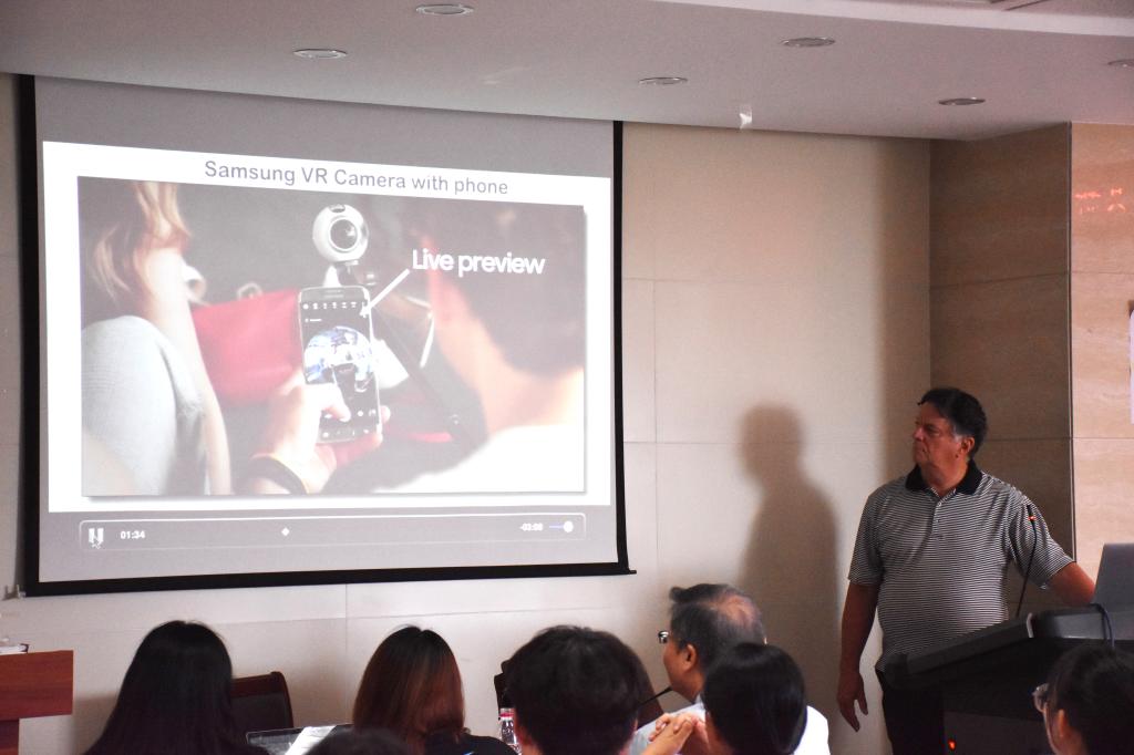 随后几天的课程中,赖斯教授和章博士详细介绍了同期声、环境声、画外音等声音设计,强调用声音设计让视频更具有美感,还演示了往年的优秀选题,讲解了镜头组合的原则和视频、音频剪辑的技巧。从新闻报道实践层面出发,赖斯讲述了移动媒体新闻报道与编辑的思路,同时对VR新闻拍摄进行了细致讲解。赖斯通过一系列的视频讲解了360全景手持拍摄设备的使用,并展示了大脑在观看VR新闻前后的透视图,讲述VR新闻能够让情绪低落的大脑变得情绪高涨,指出VR新闻能够成为“story living”的载体,沉浸性越好越能吸引忠诚度高的受众。