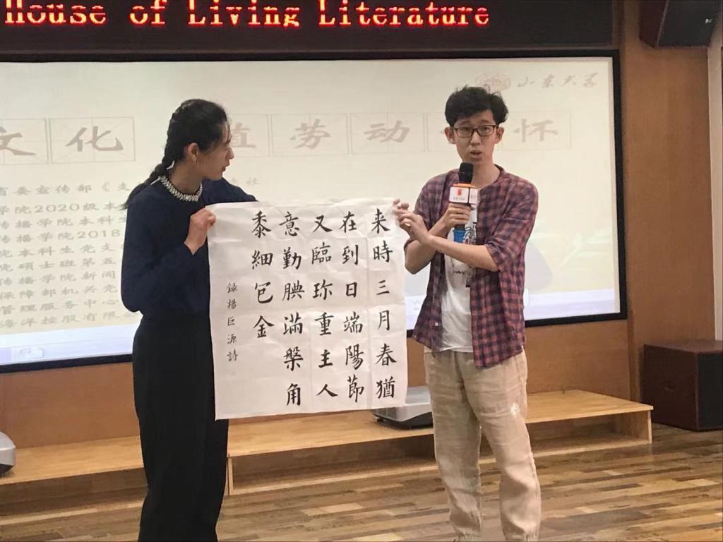 接下来,活动进入第二环节。经济学院2020级本科生党支部、det365登录网站主页本科生党支部、2018级硕士生党支部的学生以及山东海洋控股有限公司第一党支部的员工带来精彩诵读,古典诗词与现代佳作交相辉映,声情并茂的朗诵中蕴含着对伟大的爱国诗人屈原无限的敬佩与思念之情。文学院本科生党支部带来书法作品《谢人送粽》,字里行间绽放出中华民族优秀文学艺术的无限魅力。