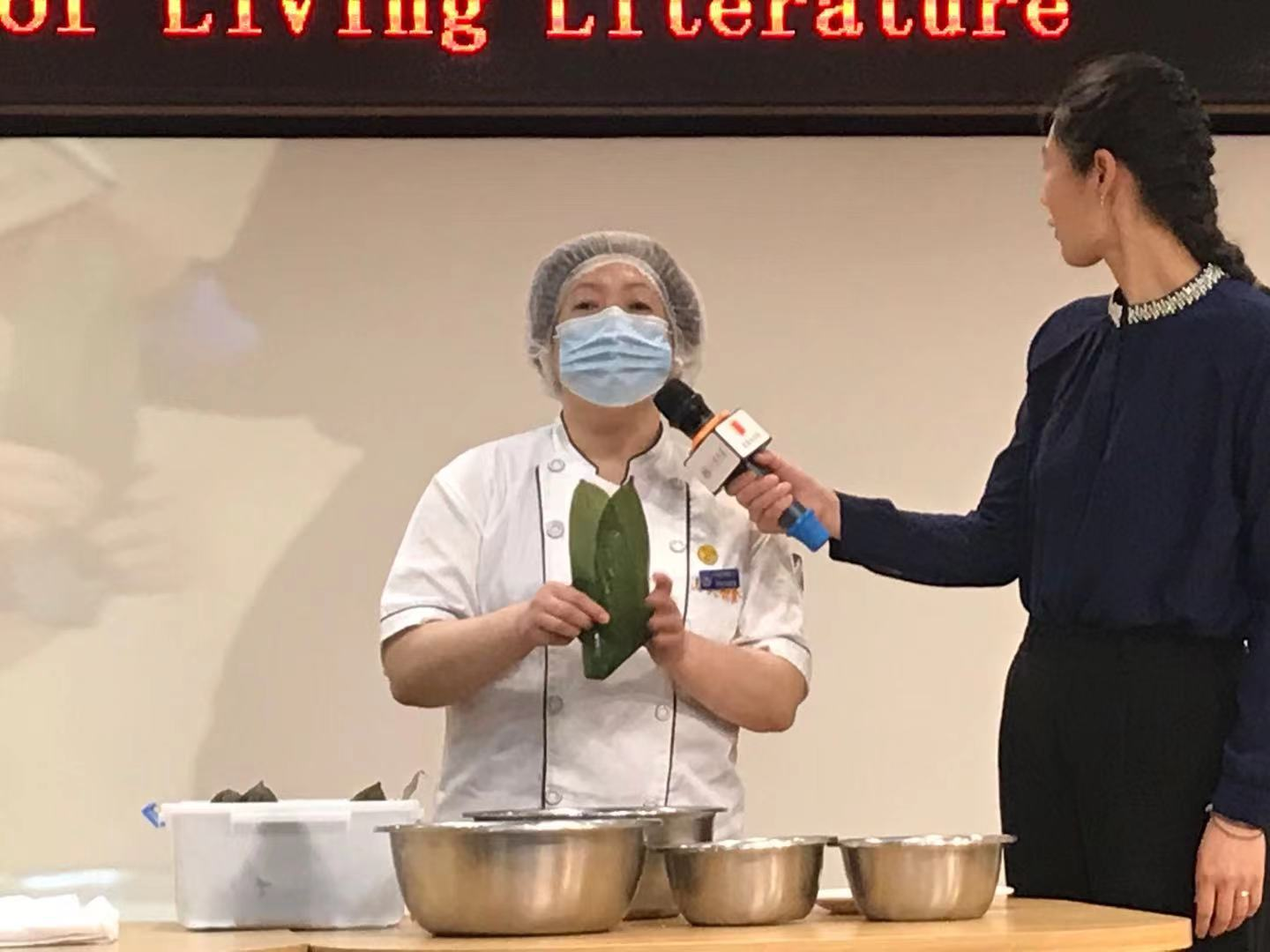 随后活动在齐园餐厅一多食堂主任来京、周秀芹师傅及多名食堂员工的技术指导下开展。首先,周师傅详细介绍了包粽子的具体制作工艺、馅料搭配,并现场演示了粽子的包制方法。各党支部分组开展活动,大家一边学习包粽子,一边讨论着端午的民族风俗,现场其乐融融,粽香四溢。