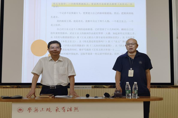 崔永刚接着讲述了寿光原县委书记王伯祥的先进事迹。王伯祥组织了寿光发展历史上著名的“三大战役”,是推动农业产业化的典型代表。而崔永刚作为新闻人,在王伯祥的故事中占据着重要的地位。崔永刚参与组织采写王伯祥的四篇报道,连续四天发表在大众日报一版的重要位置;崔志刚和王伯祥在长期的跟踪报道中产生的熟悉与信任,让王伯祥在中宣部挑选报告团成员代表时一锤定音,“让永刚同志来讲,他讲我放心”;崔志刚在北京人民大会堂汇报大众日报社对王伯祥的报道情况后,习近平主席给予了充分的肯定,鼓励媒体更好地宣传王伯祥的先进事迹。在新闻人宣传工作的推动下,王伯祥在寿光大地上,甚至在全国大地上,为后来者树起了当官做人的标杆。崔永刚还为同学们播放了当年在山东会场实际报告会的原视频片段,以便于充分了解王伯祥的先进事迹。