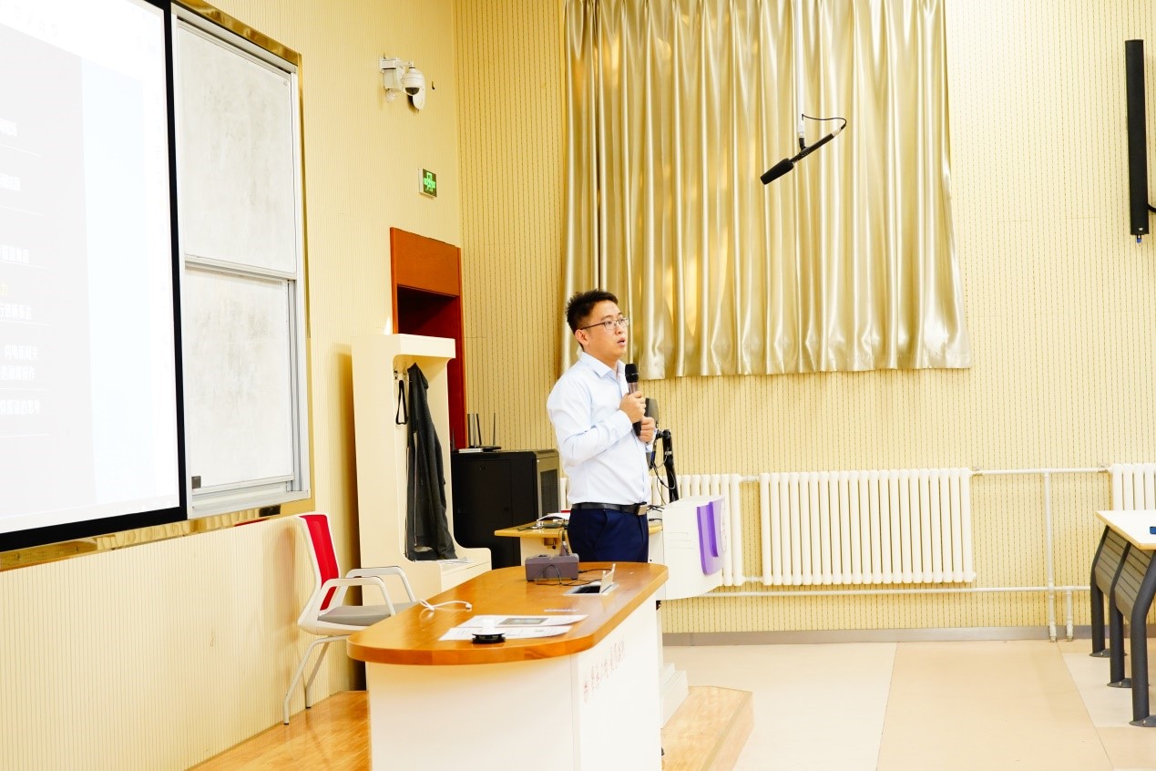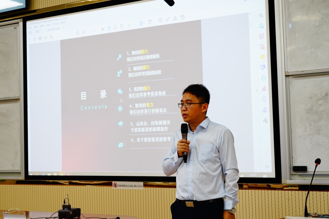 第二部分,孔冠军与同学们分享了作为记者在一线的采访故事。做好新闻,需要勤快的脚力,以到达新闻现场;需要敏锐的眼力,以寻找新闻选题;需要善思的脑力,以思考报道角度;需要独特的笔力,以进行创新表达。面对来势汹汹的新冠肺炎疫情,迎难而上,冲锋在前,敢于直面疫情的危险。2020年大年初一,孔冠军跟着山东第一批援助湖北医疗队到达了湖北黄冈,从济南出发,经武汉至黄冈,在湖北的黄冈市工作了57天。他说:“这是一场没有硝烟的战争,我们新闻记者有义务有责任也要冲到一线,帮助武汉渡过难关,为武汉加油。”在疫情防控的主战场上,他做了许多人物报道,践行了一名新闻记者的责任、使命和担当,用自己的力量发现更好的故事,更好地讲好抗疫故事。孔冠军通过播放视频,将一些具体过程展现给同学们。