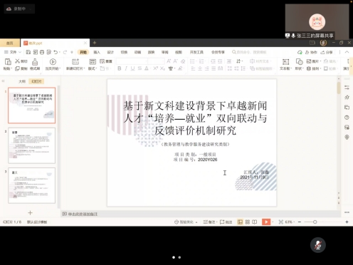 张鑫对《基于新文科建设背景下卓越新闻人才“培养——就业”双向联动与反馈评价机制研究》进行结题汇报,项目围绕培养、就业两个人才生产端口,从就业角度回顾整个人才培养情况,基于教务工作的基础环节,对新闻传播人才培养和就业进行研究,助力学科新文科建设,强化就业对人才培养的认识,通过培养环节的动态来促进复合型人才培养,为人才培养提供坚实的基础和完善的环节,努力打造具有det365登录网站主页特色的一流新闻传播本科专业,完善培养就业双向互动的反馈机制。同时项目着重研究学科交叉融合,不断升级人才培养模式,对学院培养方案更新、毕业论文设计改革进行推进,结合学科创作新闻传播卓越人才核心竞争力的结构模型,不断推动学院教务工作的有序进行。