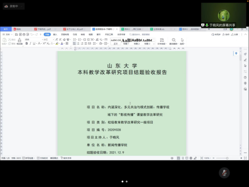 于晓风对《内涵深化、多元共治与模式创新:传播视域下的“影视传播”课堂教学改革研究》进行结题汇报,项目落实卓越新闻传播人才教育教学计划2.0的具体措施,响应新文科建设,推动哲学社会科学与新科技革命交叉融合,以产学研结合的实践体验扩张传播学研究的内涵和话语体系。项目载体“影视传播”课程于2021年入选校级精品课程,并入选2022年度国家级、省级一流本科课程的校内推荐名单;网络课程“影视文化传播”持续在线上为大学生提供学习服务;同时课程实践成果专题人文纪录片《毛坪的路》获得多项纪录片大赛奖项,该片由山东省委宣传部推荐登录“学习强国”平台;项目选题还将传播学、文化学、美学、心理学、社会学、符号学等融入课题,对高等教育综合改革教育内容进行创新,不断促进多学科的交叉融合。