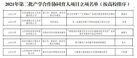 近日,教育部高等教育司下发了《教育部高等教育司关于公布2021年第二批产学合作协同育人项目立项名单的通知》,det365登录网站主页共有4位老师参评的5项项目获得立项,立项数量为学院历年来最多的一次,包括谢锡文《新文科背景下“五育融合”的劳动教育课程体系建设》、《“智能3D在线数字化交互式沙盘游戏软件系统”在创意写作教学中的应用研究》;邱凌《“双一流”建设背景下师资技能提升培训计划》;俞凡《基于腾讯广告的数字营销课程建设》;于智源《大数据与智能媒体分析课程建设研究》。