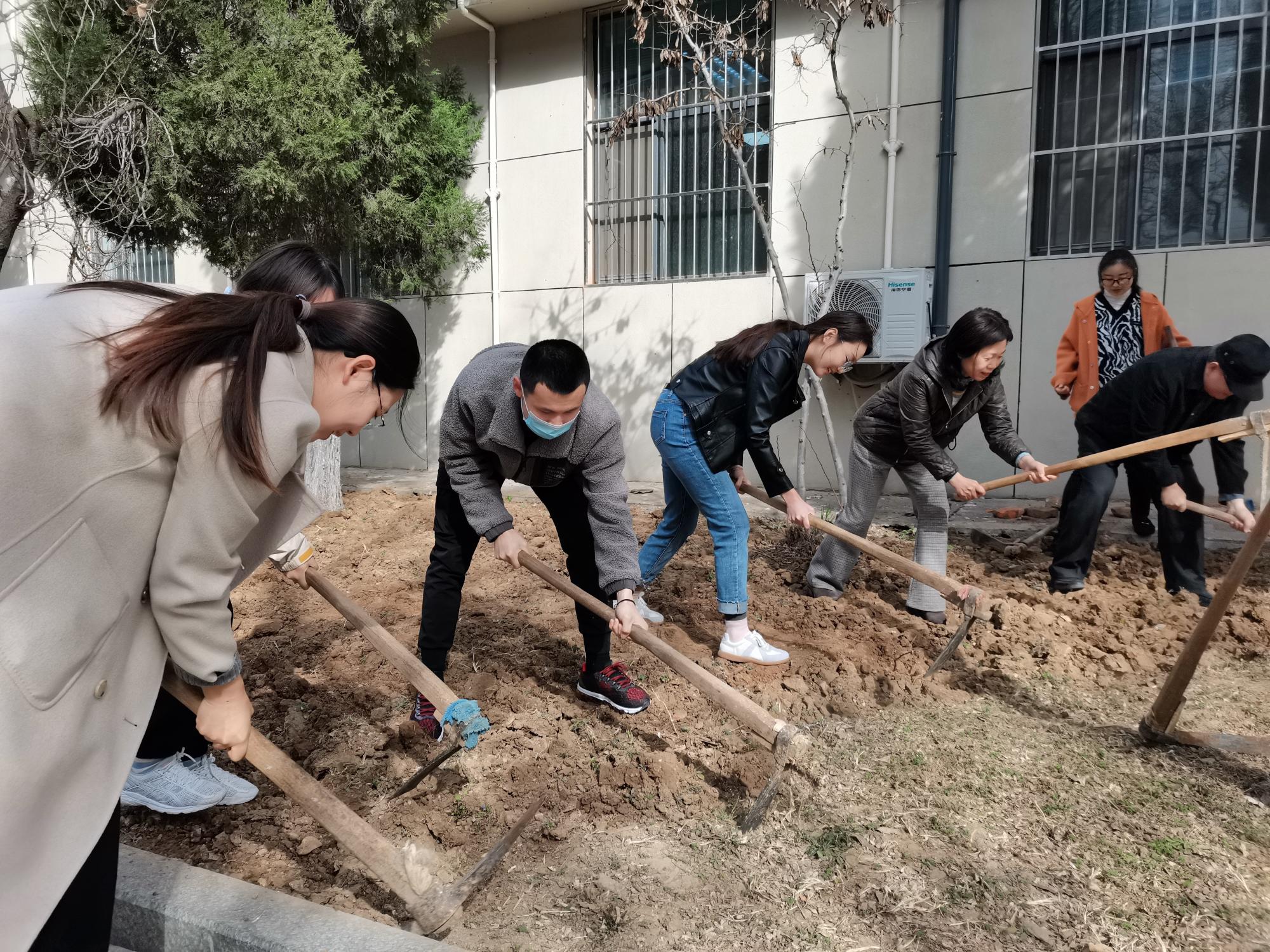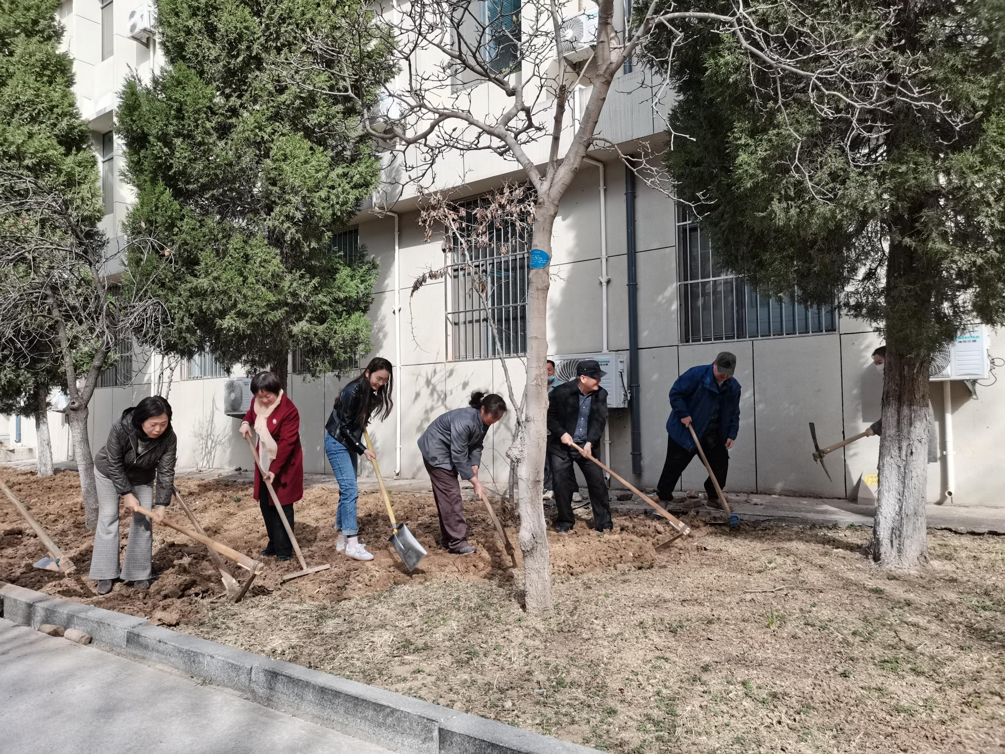 在劳动现场,学院学术委员会主任唐锡光老师积极组织协调,在专业绿化人员的指导下,大家接过工具,挥锹铲土,一起热火朝天地干起来。温暖的阳光洒在劳动者的身上,形成了春天里一道靓丽的风景线。劳动过程虽然劳累,但每个人都体会到了劳动的乐趣,牢固了“劳动最光荣、劳动最崇高、劳动最伟大、劳动最美丽”的观念。