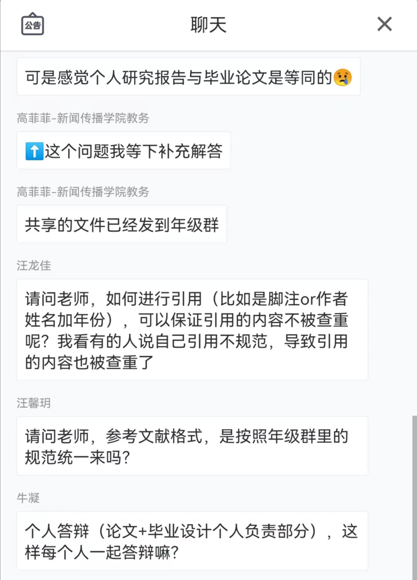 会后杨晓冬将会议上所解答的内容整理成文字稿发到年级群内,为同学们毕业论文与毕业设计的顺利进行有效助力。