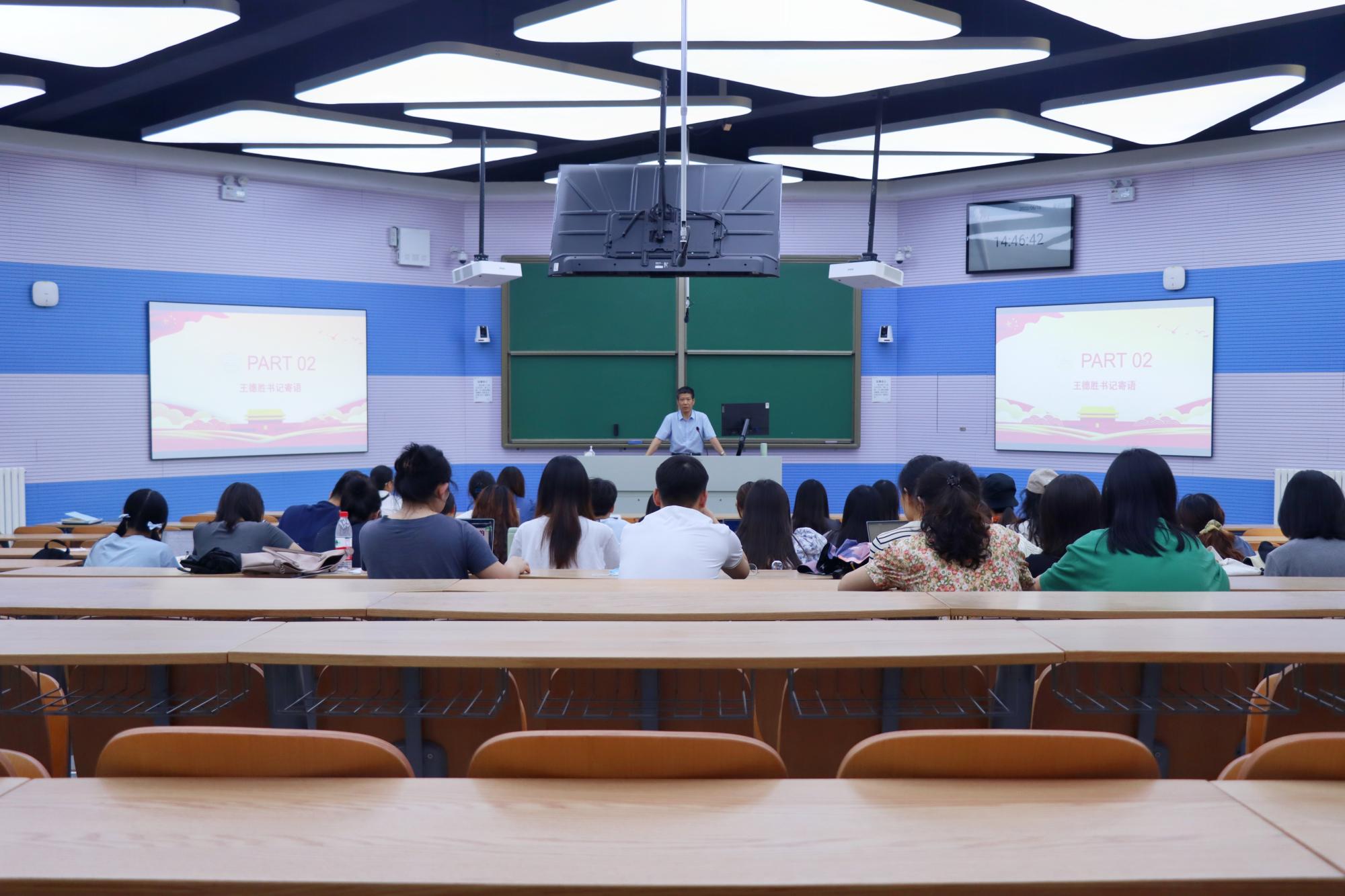随后,王德胜给毕业生党员上“最后一堂党课”。首先,他向顺利毕业的同学们表示祝贺。他表示在百年未有之大变局与新冠肺炎疫情的大背景下,同学们的成长是一场考验,也是一次别样的经历。无论是顺境还是逆境,同学们都要学会在不断地反思中走向成熟。知识到能力的过渡需要深度实践来完成,能力沉淀成素养离不开深度的思考和反思,若想将素养提升成境界则需要持续地“修炼”。其次,他叮嘱毕业生党员们要在未来的学习和生活中担当起党员责任。在中华民族伟大复兴的关键时期,青年党员要明确时代方位和自身责任,勇担时代使命,将入党誓词“内化于心,外化于行”。生逢其时,接续奋斗,不辜负党和人民对青年寄予的厚望。“干中学,学中干”不断地汲取新的知识,培养自身的核心竞争力,在新的人生阶段勇敢地去追求更高的理想。最后,王德胜强调,青年党员要加强党性的“修炼”。他从每个人的成长环境的角度分析了青年一代普适性的特点,并且告诫同学们要注意摆脱人性天然的“劣根性”。他提醒同学们要牢记习近平总书记的话:“用脚步丈量祖国大地,用眼睛发现中国精神,用耳朵倾听人民呼声,用内心感应时代脉搏。”要克服自身的缺点与思维上的矛盾性,同时加强体质锻炼,勇于面对新的人生挑战,实现真正的“蜕变”。“作为师长,真诚地期盼你们在未来的生活中取得更好的成绩,期待你们鹏程万里,一切顺利,常回学校看看,我们牵挂着你们!”
