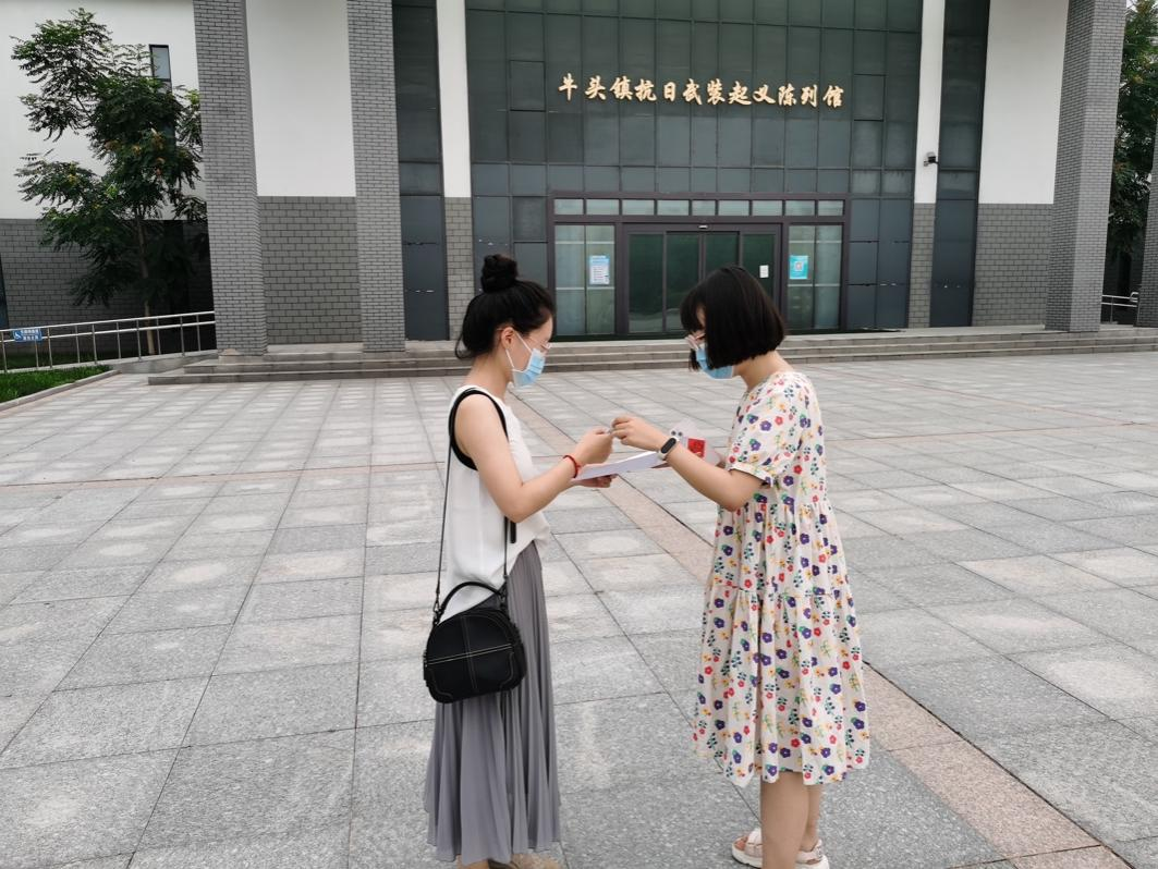 (上图为队员向陈列馆前的游客发放调研问卷)