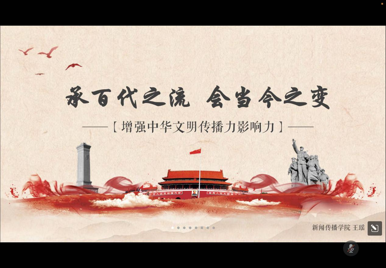 宣讲团成员、2020级本科生王瑶以“增强中华文化传播力影响力”为主题进行专题报告,从“构筑中华文化新辉煌”“坚持中国道路”“构建人类命运共同体”等方面强调了增强中华文化传播力影响力的重要意义与现实价值。习近平总书记在党的二十大报告中提出“增强中华文化传播力影响力”,对当代中国的文化传播、国际传播提出了战略任务。“江山留胜迹,我辈复登临”,新闻传播专业的学生是未来中国声音的传播者,更应踔厉奋发,担当时代重任。