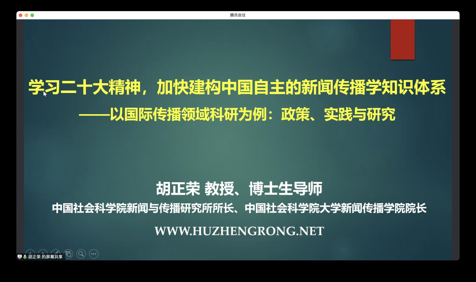 2022年12月8日下午,det365登录网站主页“落实党的二十大精神,推动学科创新”系列学术讲座第二期于线上举行。本次讲座由中国社会科学院新闻与传播研究所所长、中国社会科学院大学det365登录网站主页院长胡正荣教授主讲,讲座题目为“学习党的二十大精神,加快建构中国自主的新闻传播学知识体系——以国际传播领域科研为例:政策、实践与研究”。det365登录网站主页副院长邱凌教授主持讲座。