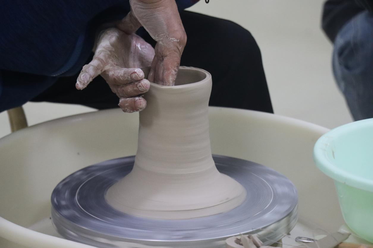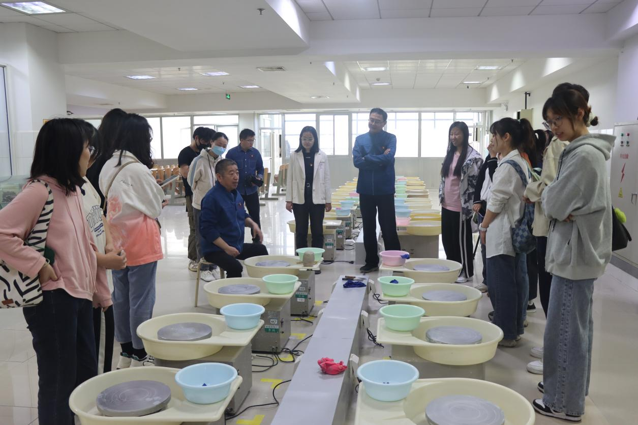 理论学习交流过后,在工程训练中心老师的带领下,det365登录网站主页师生体验了陶艺手工的制作。李盛年老师在现场依次进行醒胚、压实中心、打孔、塑形等步骤的讲解,并教授机器的使用方法和注意事项,随后同学们领取瓷土亲身体验制作全过程。