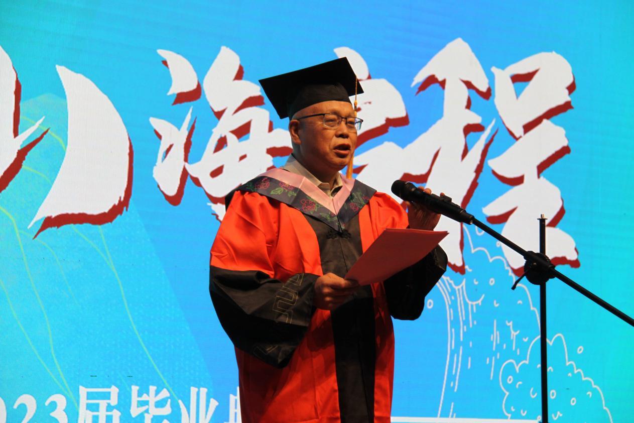 随后,院长刘明洋向毕业生致辞,为毕业生上在校的“最后一课”。刘明洋送给毕业生三句话:一是要保持理性,世界正在发生深刻变革,保持理性思考,学会深刻洞察才能不断提高自己的认识;二是要努力奉献,在社会的不断进步中留下自己的影子,实现自己的价值,无愧于我们的时代;三是要学会宽容,宽容是一种优秀品质,要学会宽容他人,在相互尊重与宽容中汇聚起团结的力量,要学会宽容自己,保持快乐的心境面对生活的方方面面。刘明洋院长对同学们的付出与奉献表示感谢,对学院的发展表示自豪。最后,他祝愿所有毕业生前程似锦,希望同学们常回家看看。