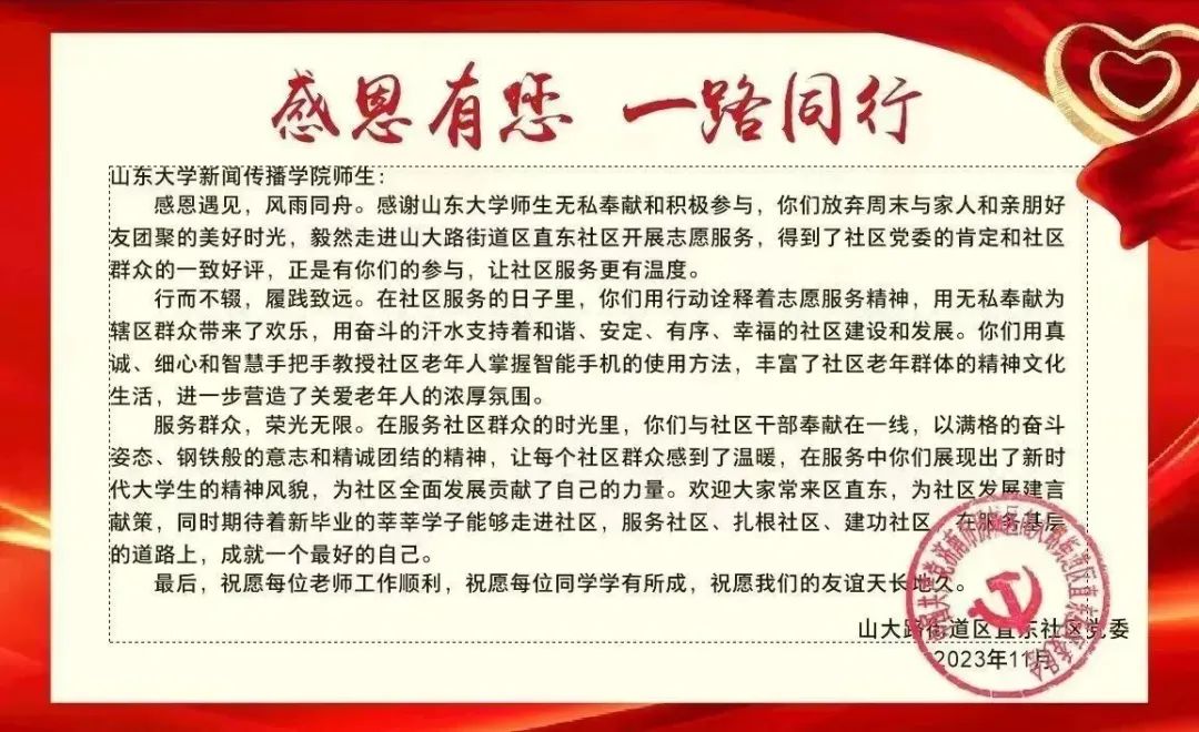 2023年11月,山大路街道区直东社区党委发来了对det365登录网站主页师生的感谢信,对det365官网开展的社区志愿服务表示了由衷的赞扬和真挚的感谢。