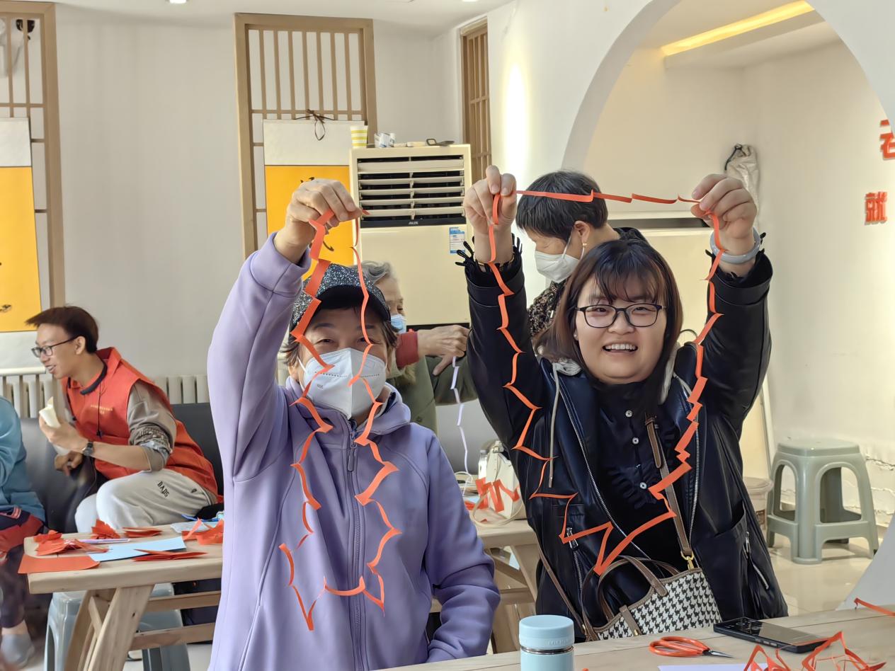 在折叠旋转星的过程中,老人们略显吃力。志愿者们及时反应,细心关照遇到困难的老人,为他们提供一对一、手把手教学。在双方的共同努力下,老人们成功折出了自己的旋转星。他们脸上洋溢着满足的笑容,与作品合影留念。