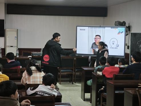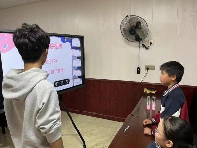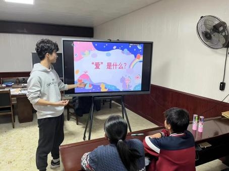 队员高希铭对孩子们进行了“爱的教育”。他从“爱是需要表达的”、“爱是相互的”以及“爱是为了成长”这三个维度向孩子们阐释了爱的内涵,旨在让孩子们学会如何健康地爱自己与他人。首先,他通过播放《怦然心动》、《海蒂与爷爷》和《真爱至上》等电影片段,让孩子们深刻体会了爱的多元性。接下来,他向孩子们强调了“爱是相互的”这个事实,通过引出“爱的账簿”这个概念帮助他们理解爱的真谛。课程的最后是自由创作和自由发言活动,孩子们在纸张上画下了“爱”的象征物,诠释了自己对于“爱”的理解,能够更加自信地、合理地表达爱意。