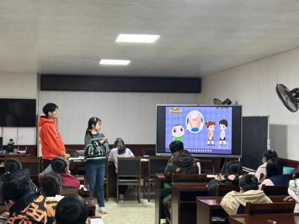 支教队成员邱彦频对孩子们进行了“青春期的生理卫生教育”。她从“生命的起源”、“防范性侵害”、“悦纳青春期”这三个维度展开。首先用一段有关生殖器官的科普视频引入课堂,以一问一答的形式带着孩子们认知了自己的身体部位。然后,向孩子们介绍性侵害的类型以及防范性侵害的方式,区分了良好接触和非良好接触、安全区和非安全区,向孩子们反复强调了“自我意愿”是定义性侵犯中的关键。最后,队员们还介绍了如何进行青春期的生理卫生呵护,张子越借助科普视频讲解了梦遗的生理过程。随后,邱彦频向孩子们展示了使用卫生巾的正确方式,引导孩子们上前进行演示,鼓励他们摆脱月经羞耻。在此过程中,孩子们从羞涩走向勇敢,开始正视自己的身体与性意识,懂得了要严肃地对待同“性”有关的话题。