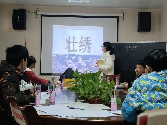 “北冰洋”支教队的队员们开设了“广西白话方言体验感悟”课,从广西白话的特点、应用场景以及韵律音调这几方面带着孩子们探讨广西白话的独特之处、领悟其背后蕴藏的文化底蕴。此外,志愿者还通过游戏、表演等形式,让孩子们深入体验了乡音的魅力,激发了孩子们对于方言保护的意识。除了方言,广西壮绣文化也是本次支教活动的亮点之一。在2024年2月2日,志愿者向孩子们介绍了广西壮族刺绣文化,详细讲解了不同壮秀花纹背后的文化内涵。志愿者带领着孩子们临摹壮秀的纹样、自我创作,加深了他们对广西壮族文化的认知,也唤起了他们对本土文化的自豪感和传承责任。通过传承南宁方言、宣扬广西壮绣,支教队成员们不仅为孩子们打开了一扇了解家乡文化的窗口,也为南宁乡村的文化传承注入了新的活力。