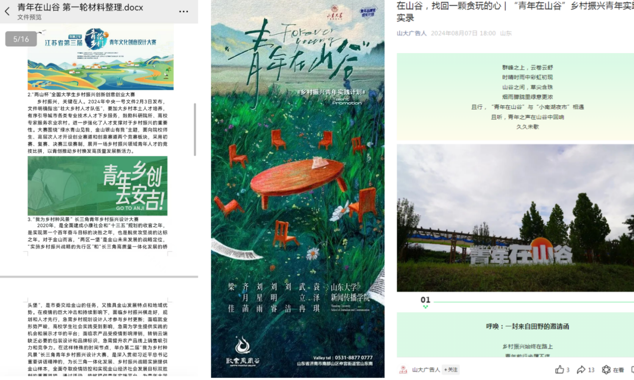 实践活动分为线下线上两部分,团队成员分工明确,发挥所长。在前期筹备中,团队聚焦创新发展,召开线上会议进行讨论,明确后续各项任务分工,并搜集以“青年”“乡村振兴”“文化创意”等为关键词的研究文章,进行文献综述和案例整理,从中汲取经验加以学习。同时借助制作海报、撰写推文等多种方式助力活动推广,并在“山大广告人”等公众号发布文章扩大宣传覆盖面,以期吸引更多青年的目光,注入青春活力与无限创意。