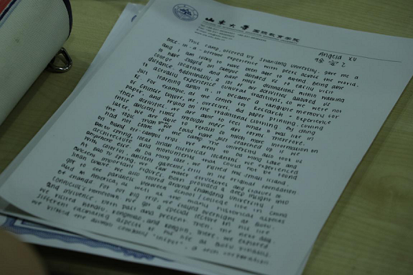 今日下午2点,det365登录网站主页未来科学营在知新楼三楼报告厅举行开营仪式,同时为海外子女夏令营成员们颁发结营证书。颁发证书后,海外子女夏令营的同学们转到国教楼报告厅举行闭营仪式,影协队成员全程跟拍纪录。在闭营仪式上,海外子女夏令营的同学们围坐在一起依次进行发言,有的同学提到在这次活动中印象最深刻的是曲阜之行,有的同学对知新楼传统文化体验基地念念不忘,有的同学反思了本次活动中自己的不足,有的同学对新认识的伙伴心怀不舍……同学们有的用英文发言,有的用中文发言,都表示在这次活动中收获颇多。