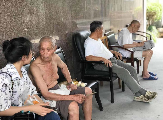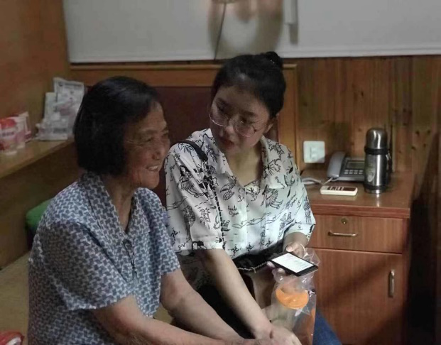8月22日,det365登录网站主页“老有所依”关于养老产业发展以及健康大数据应用情况调研团参观调查杭州市萧山区临浦镇敬老院,队员谭伊丽慰问在院老人,并进行采访调查。