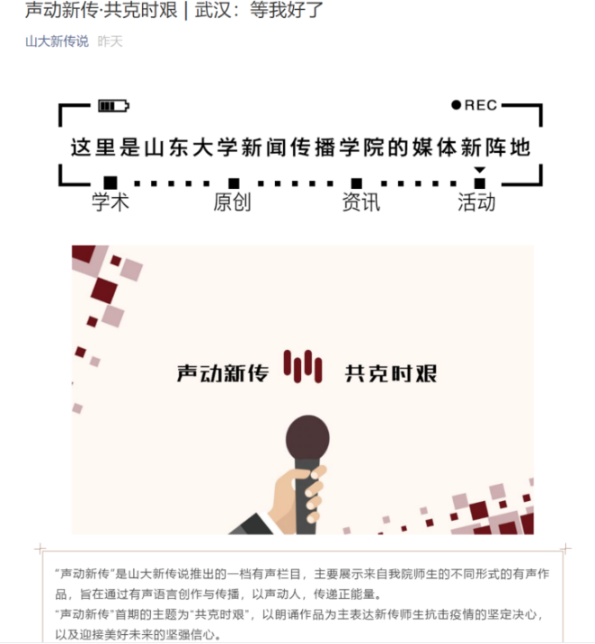 近日,det365登录网站主页学生党支部、团委共同发起了“声动新传·共克时艰” 声援抗“疫”文化活动,该活动在det365登录网站主页微信公众号平台“山大新传说”正式上线。