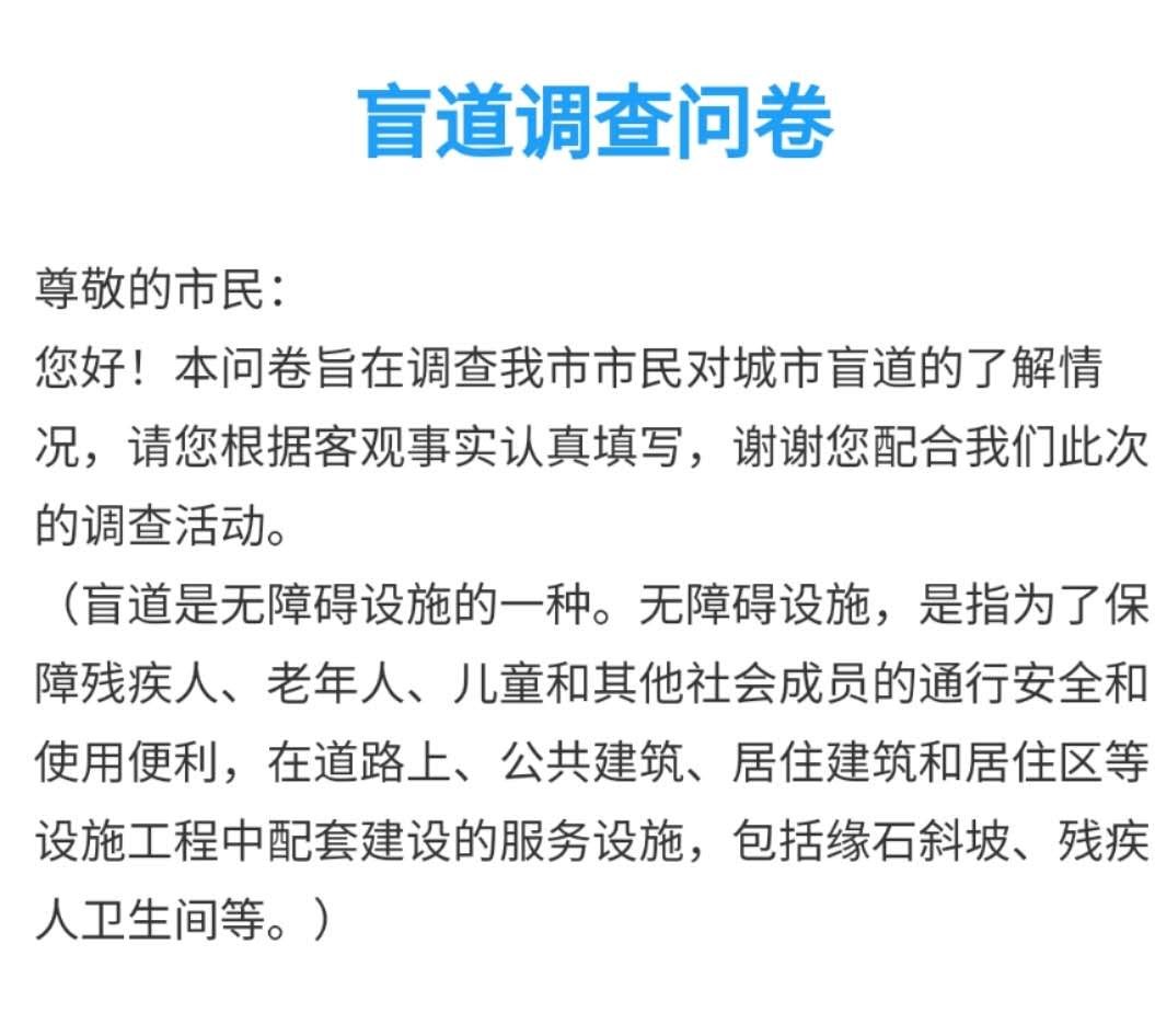8月11号,det365登录网站主页“护航”赴临沂关于盲道的建设与使用调研团开始线上调研,调研以发布问卷方式开展。问卷以文献综述提供的理论资料和实地调研收获的实践观察成果为基础编制,以全国各省市居民为对象,主要调查其对盲道的了解程度和所在地区盲道建设的基本情况。