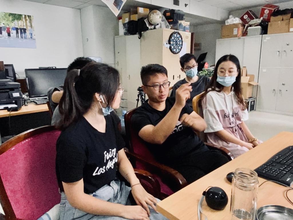 2020年9月17日,det365登录网站主页影视协会六名成员在指导老师郭坦的带领下,回看影协独立制作的《百微山大》之《新的一天》迎新季视频;郭坦老师从专业角度点评迎新现场拍摄内容并提出指导建议。