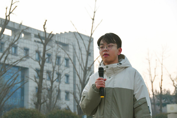 在师长寄语部分,辅导员宋石猛为大家讲授微团课。他以“新闻人的‘勇气’‘智慧’‘责任’三个标签如何排序”的问题引入,讲述了疫情期间新闻工作者的感人事迹和新华社湖北分社记者熊琦与方舱医院“读书哥”的故事,勉励大家认真学习专业知识,锤炼过硬本领,负起一份责任,撑起一方天地。