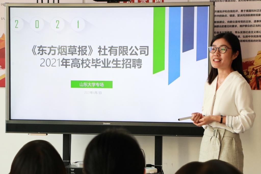 活动主要有企业介绍、招聘计划讲解以及现场答疑三部分。《东方烟草报》宣讲人员针对学生比较关注的内容进行了细致的介绍并耐心回答现场同学的提问。