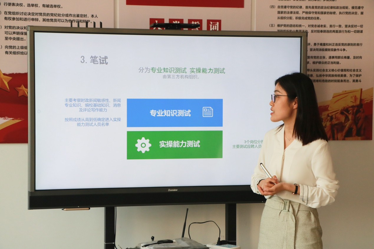 在介绍完招聘岗位及对象后,葛营营重点讲解了报社的招聘程序,即需要经过网络报名、资格审查、笔试、面试以及考察五个环节,并补充正式的招聘程序将于近期发布,感兴趣的同学可以关注公司官方账号平台,以正式发布的招聘公告为准。在最后的答疑部分,现场同学针对单双休问题、招聘环节占比以及招聘公告的具体发布时间进行了提问,宣讲人员分别予以解答。