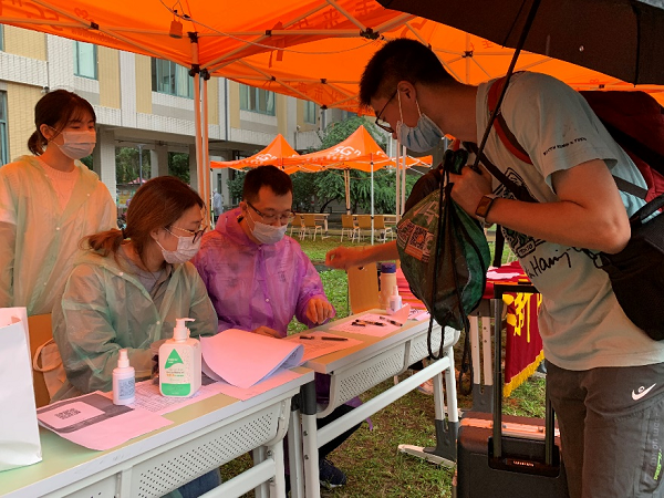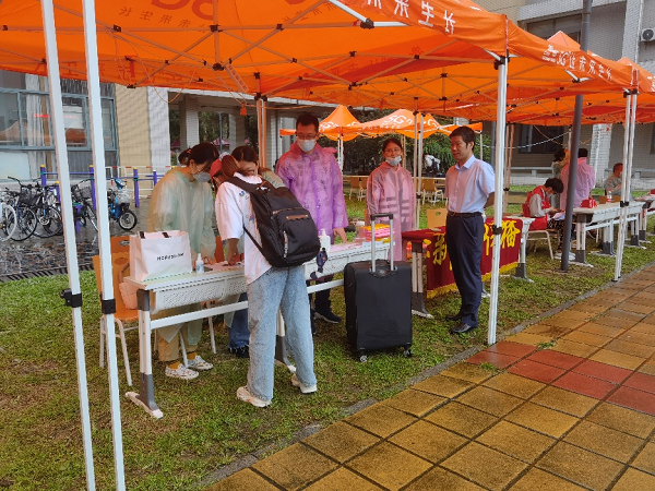 上午七点,返校工作人员进驻学生报到点进行场地布置,面对突如其来的大雨,及时调整工作方案,对悬挂的横幅、应急物资进行了防雨处理。在报到点帐篷,单独预留了学生行李存放处。八点钟,首批返校学生进入校园,值班员按照相关流程,带领志愿者核查学生身份、检验返校资格、引导核酸检测、确认信息签字,并提醒学生做好体温观察和卫生防疫工作。