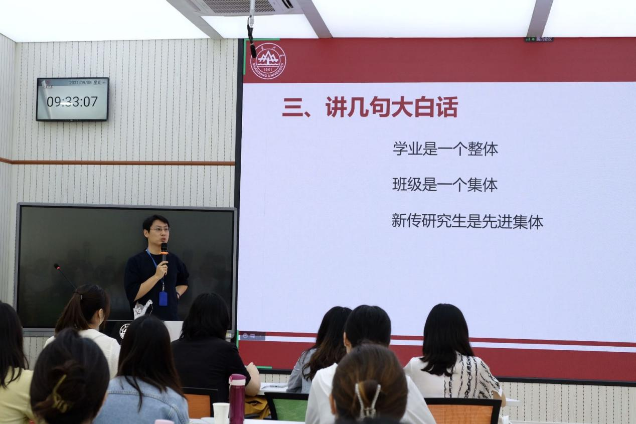 团委负责人杨璐向2021级新生介绍学院行政架构、学生组织、班委设置等内容,并带领大家一同学习了研究生学生手册。他表示,希望同学们能“跳出舒适圈”,不躺平,不断进步;“减少游泳圈”,坚持锻炼,保证有个健康的体格;“拓宽朋友圈”,主动参加学生组织,拓展人脉。同时,他也希望各位能具备规矩意识、看齐意识、路线意识,遵守学校规章制度,顺利完成在山大的学业。