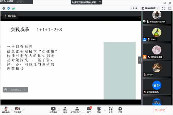 社会实践先进个人代表林婧璇作社会实践经验分享。林婧璇重点介绍了自己在社会实践团队中的工作,如何在多项实践活动中做好协调。林婧璇作为共赴康健团队的负责人,统筹协调各项工作,在项目操控、细节把握、内容宣发等各方面进行了全方位、多角度、深层次的介绍,为学弟学妹们指明了未来社会实践的谋划方向。