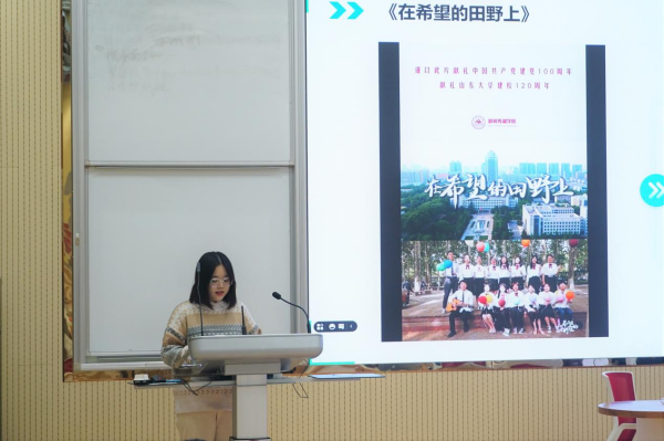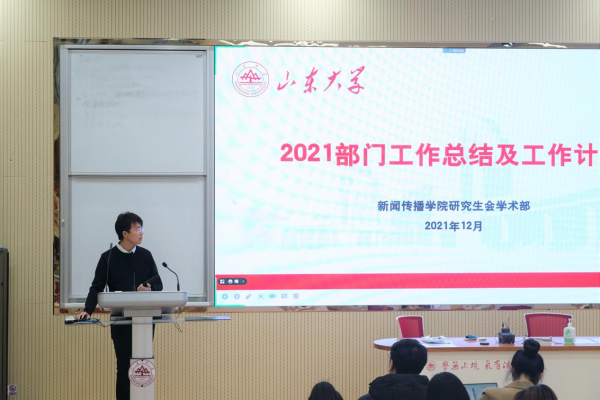 宣传部负责人牛如意,以翔实的数据,展现部门在信息发布、摄影摄像、物料设计三大方面的具体工作。公众号“视听新传播”运营一年间,浏览次数累计过万,获得全院师生一致好评。宣传部联合其他部门,特制《在希望的田野上》《少年》两部MV献礼建党百年和山大百廿校庆。此外,宣传部在本年度搭建并完善研会共享网盘,为各部门的工作提供了便利,实现资料的有序整理和保存。