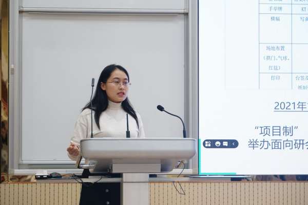 办公室负责人戴永洁,从加强综合统筹、修订完善制度、统筹财务核算、协调沟通联动四个方面介绍了办公室的工作情况。办公室与各部门协同发力,共同筹备完成学校十佳研会答辩工作,助力学院赢得了“十佳研会”荣誉。下一步办公室将贯彻校团委的要求,积极反映学生权益和同学呼声,为学校建设发展增砖添瓦。