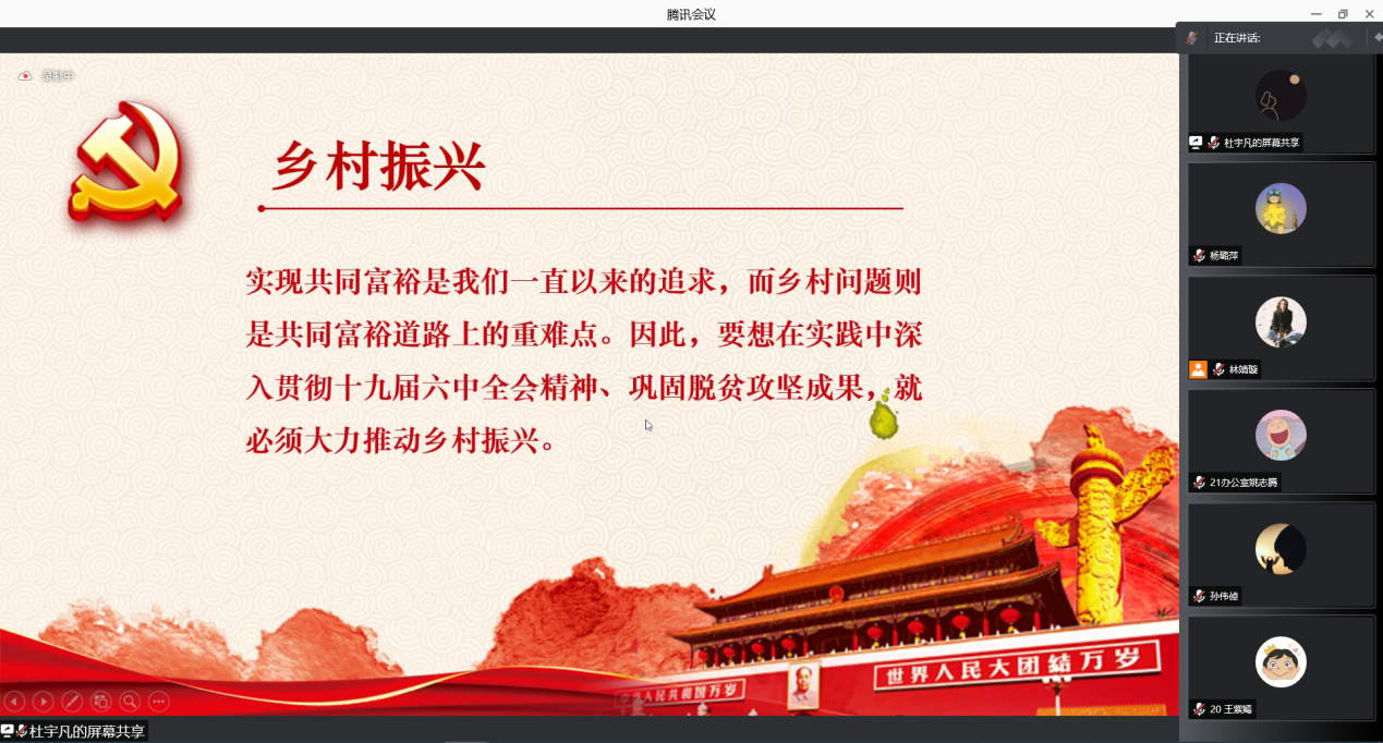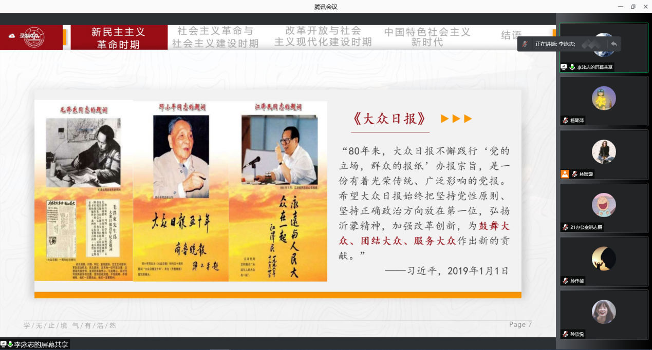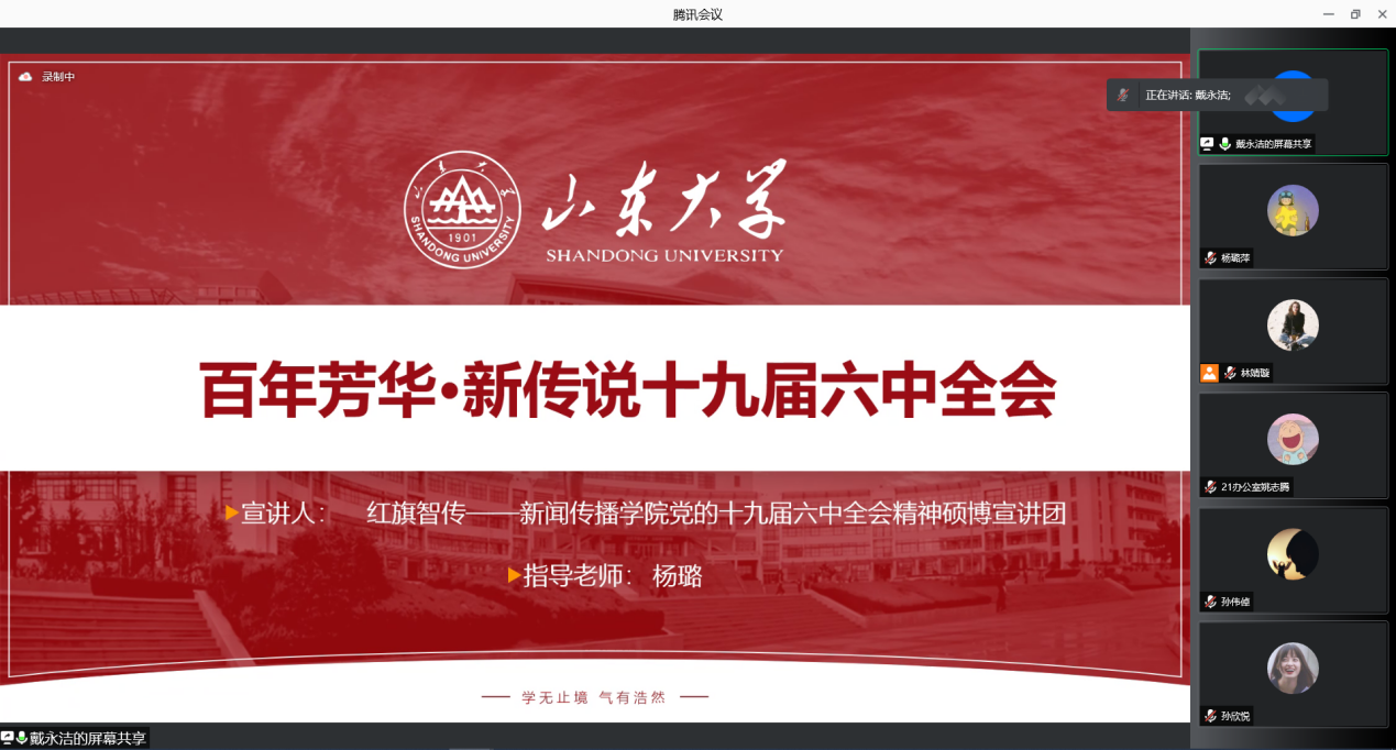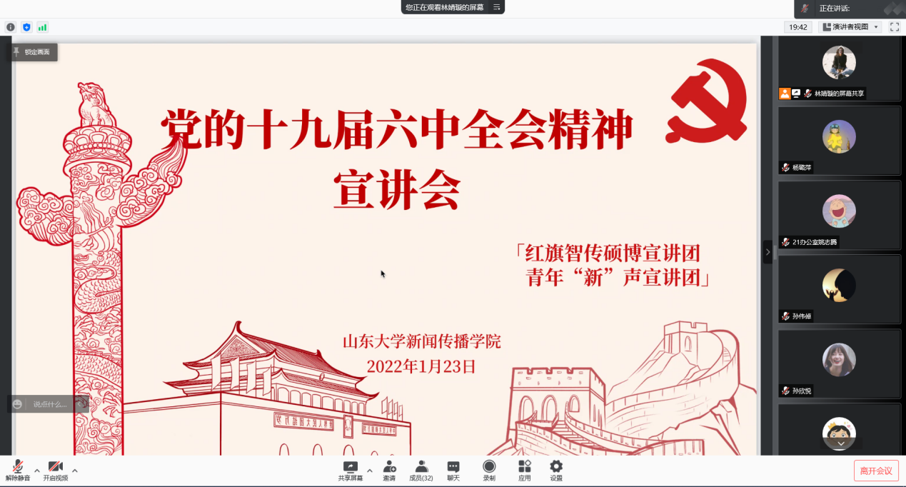 为推动学院同学深入学习党的十九届六中全会精神,2022年1月23日下午,学院“红旗智传——det365登录网站主页党的十九届六中全会精神硕博宣讲团”与“det365登录网站主页青年‘新’声宣讲团”两支校级立项团队面向学院一委三会全体学生骨干开展党的十九届六中全会精神宣讲活动。两支团队从党的人民性工作指向、新闻舆论工作、乡村振兴与脱贫攻坚等视角对党的十九届六中全会精神进行解读,为同学们深入学习理解党的十九届六中全会精神提供了多样视角。