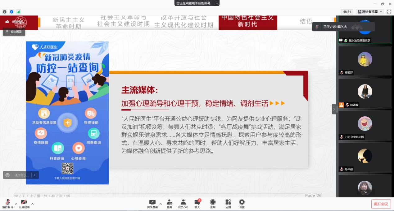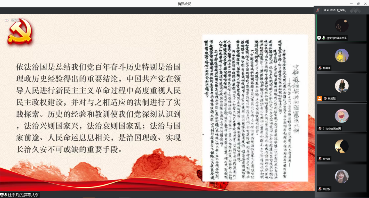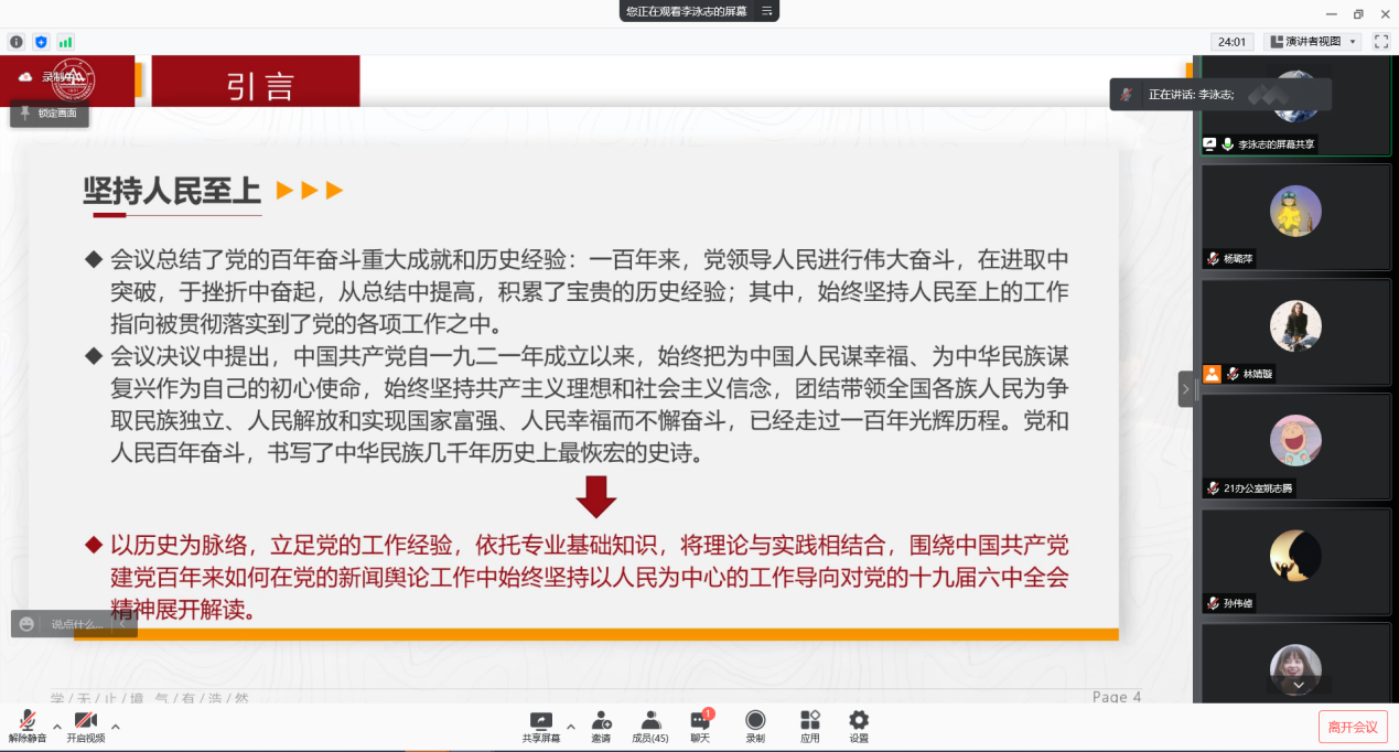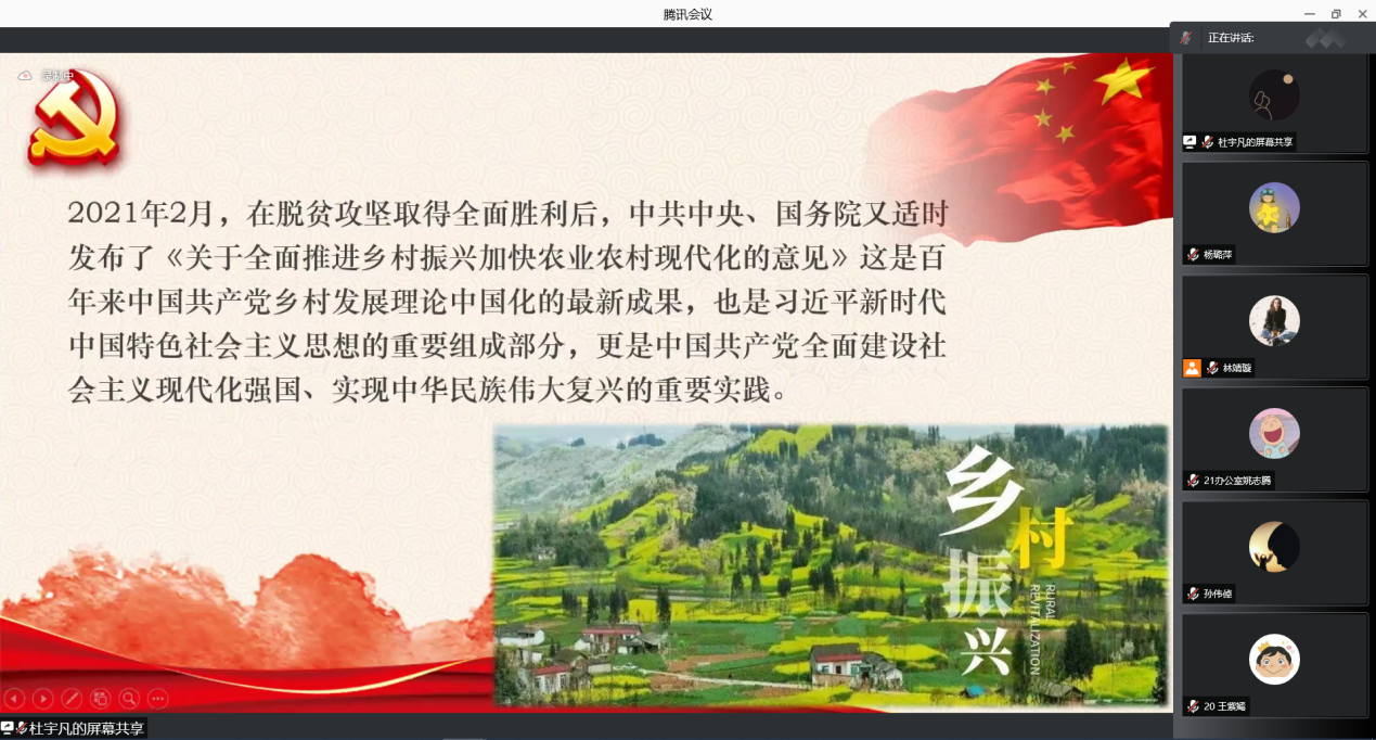 为推动学院同学深入学习党的十九届六中全会精神,2022年1月23日下午,学院“红旗智传——det365登录网站主页党的十九届六中全会精神硕博宣讲团”与“det365登录网站主页青年‘新’声宣讲团”两支校级立项团队面向学院一委三会全体学生骨干开展党的十九届六中全会精神宣讲活动。两支团队从党的人民性工作指向、新闻舆论工作、乡村振兴与脱贫攻坚等视角对党的十九届六中全会精神进行解读,为同学们深入学习理解党的十九届六中全会精神提供了多样视角。
