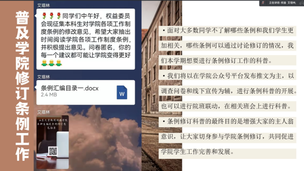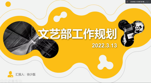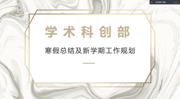 许雯作为学术科创部的代表进行汇报。她首先对学术科创部寒假工作做了总结,包括组织开展线上读书会和“青年评热点”收尾工作。随后,她向同学介绍了学术科创部新一学年的工作规划:美育主题讲座、读书日活动、考研经验分享会、毕业季工作等。最后,许雯总结阐述了学术科创部在上一学年取得的成就,并对新一学年的学生工作提出了新的期待。