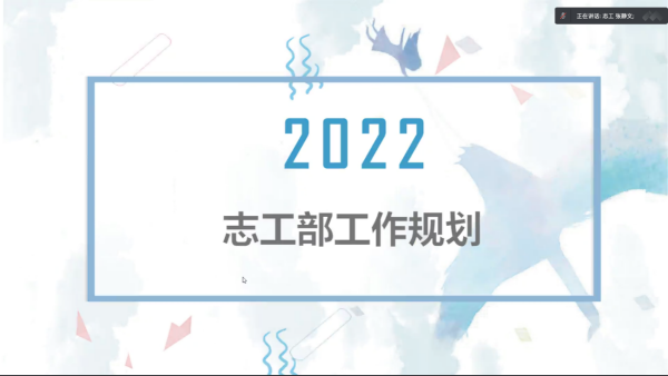 张静文对志工部工作进行汇报。她对志工部2022的工作规划进行了介绍,志工部将在新学期开展宿舍卫生检查、志愿时长录入、旧衣回收、绿植领养、绿色知识科普竞赛、心愿杯等活动。她总结道,志工部在上一学年学生会工作中总体表现较好,但仍有提升的空间,期望志工部可以在新学年继续努力。